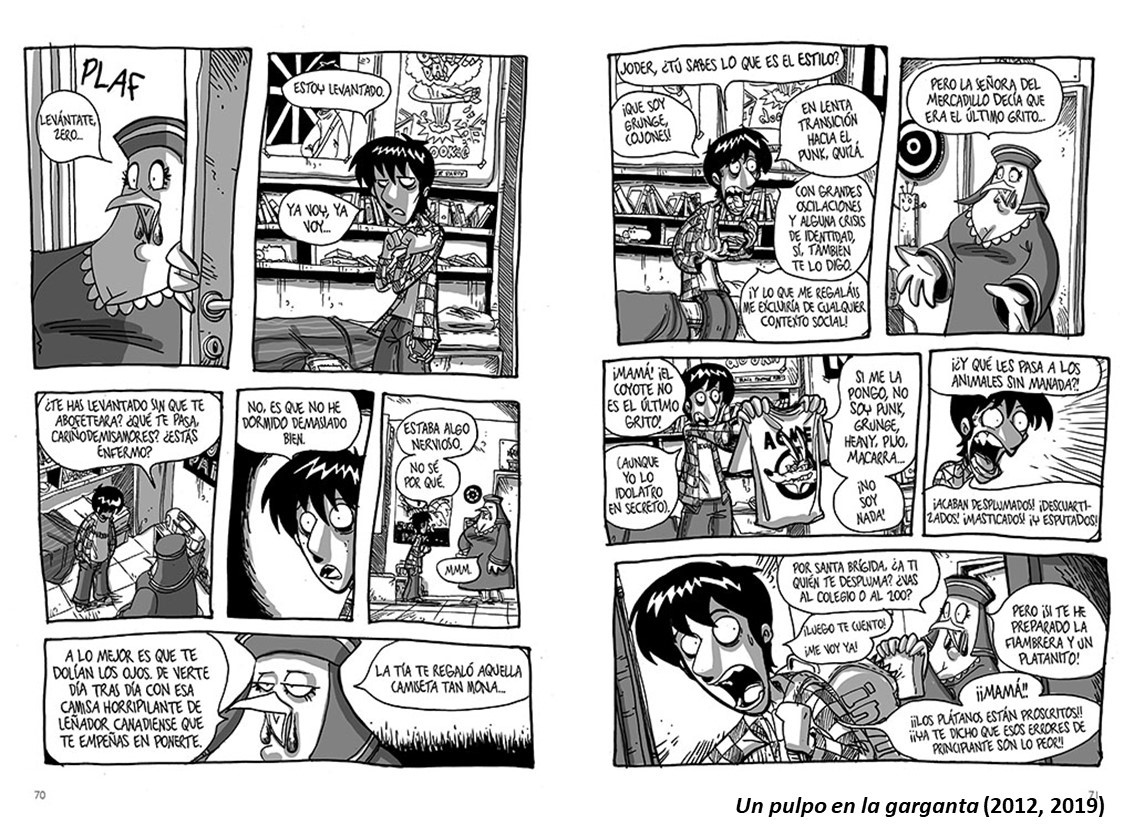 La tendresa del relat de Jabois i el traç de Seguí contrasten amb el to còmic de la següent novel·la gràfica a destacar: Un pulpo en garganta (Un polpo alla gola, 2012, 2019), amb dibuix i guió de Zerocalcare, traduït al castellà per Carlos Mayor, publicat pel segell Reservoir Books. És important conèixer la gènesi de l’obra, ja que, malgrat que sigui novetat al nostre país, en realitat és la segona novel·la gràfica publicada just després del gran èxit internacional que va suposar el seu reconegut debut La profecía del armadillo (La profezia dell’armadillo, 2011), en què el protagonista de la història era el mateix autor i narrava a la novel·la gràfica les seves vivències i inquietuds personals, tot això en converses amb la seva veu interior, representada per un armadillo gegant, que li fa de contrapès i, sobretot, dotant d’humor surrealista el relat, que ha estat des d’aleshores com una marca d’identitat de l’autor.
