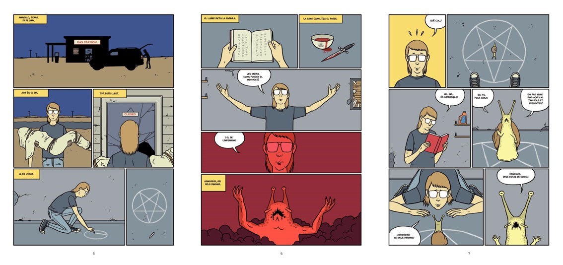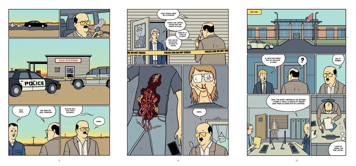 Una cosa així hauran pensat els autors de la novel·la gràfica El rei dels cargols (2024), amb guió de David Pàmies i dibuix de David Sánchez, que han situat la seva història a la ciutat de Amarillo, a Texas (Estats Units), que forma part del conegut com a Pla Estancat, un altiplà de gran extensió, una zona semidesèrtica i àrida amb una densitat de població molt baixa a causa de les condicions geogràfiques, ideal per situar la delirant història que ens proposen. Els protagonistes de la història són dos agents de policia, en Gros i en Cheto, que hauran d’investigar un doble homicidi succeït en una benzinera abandonada, aparentment relacionat amb un ritual satànic.