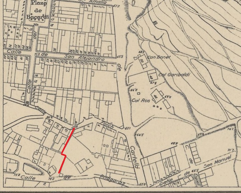 Vimos como en la parte baja la voz cantante, hasta configurar el enclave, la llevaron los contratistas Oliva Serra, con fábrica y finca en el número cinco de Pitágoras. La frontera del dueto en su tramo inferior se entiende por la entrada que sigue el trazado del carrer Pintor Mir, óptimo para marcar el antes y después en un mismo terreno.
