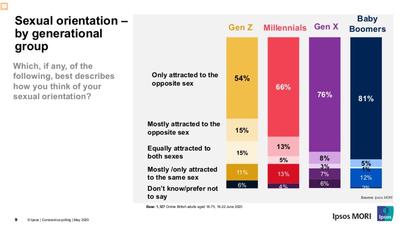 El estudio de Ipsos LGBT+ Pride 2023 dató un 9% de población total del colectivo entre los 30 países encuestados. España es donde es más probable que los encuestados digan que son gay o lesbianas (6%), siendo el segundo país con más población LGBT, un 14%, dato que se dispara entre los jóvenes, con un 18% del total: se podría decir que la Gen Z es la menos heterosexual de la historia.