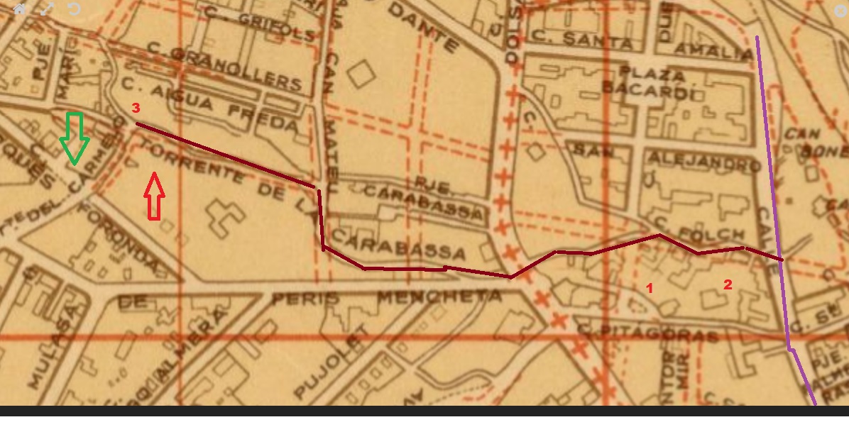 El torrent del Paradís seguía una trayectoria que puede reconocerse por la calle de Sigüenza en el Carmel, cuyo homónimo pasaje figura en un mapa parcelario como barranco del torrent del Paradís, además de ser invisible para Google Maps. Su descenso puede considerarse como el configurador original del de Can Carabassa, pues el torrent del Carmel más bien es un brazo menor en toda la ecuación, si bien tiene muchos metros detectables por su vinculación a la particular calle de Agudells. Desde aquí, una vez las aguas dejaban atrás la rambla del Carmel, aconsejo mirar las curvas de su ruta desde el mirador al final de la calle de Peris Mencheta, donde Agudells se cruza con el bello passatge d’Espiell y pierde el nombre en favor de la calle del torrent del Carmel, fenecido en esa no plaza en deshonor a las lavanderas de Horta, mayordomas de una danza de muerte concentrada en una nada, del maravilloso passatge de Granollers a las casas en lo alto, siempre en obras, medio fantasmagóricas.