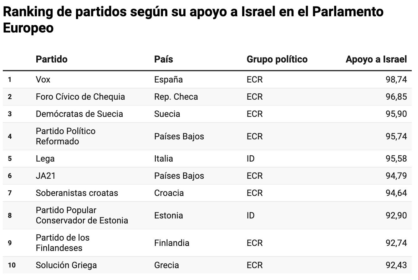 Vox es, de todos los partidos de la Eurocámara, el que obtiene una mejor puntuación por su apoyo a Israel, seguido por el Foro Cívico de Chequia, los Demócratas Suecos y el Partido Reformado de los Países Bajos. La clasificación se realiza, tal y como explica el propio informe, de acuerdo con sus votaciones en la Eurocámara, que implican de una u otra manera la defensa de Israel y de sus intereses.