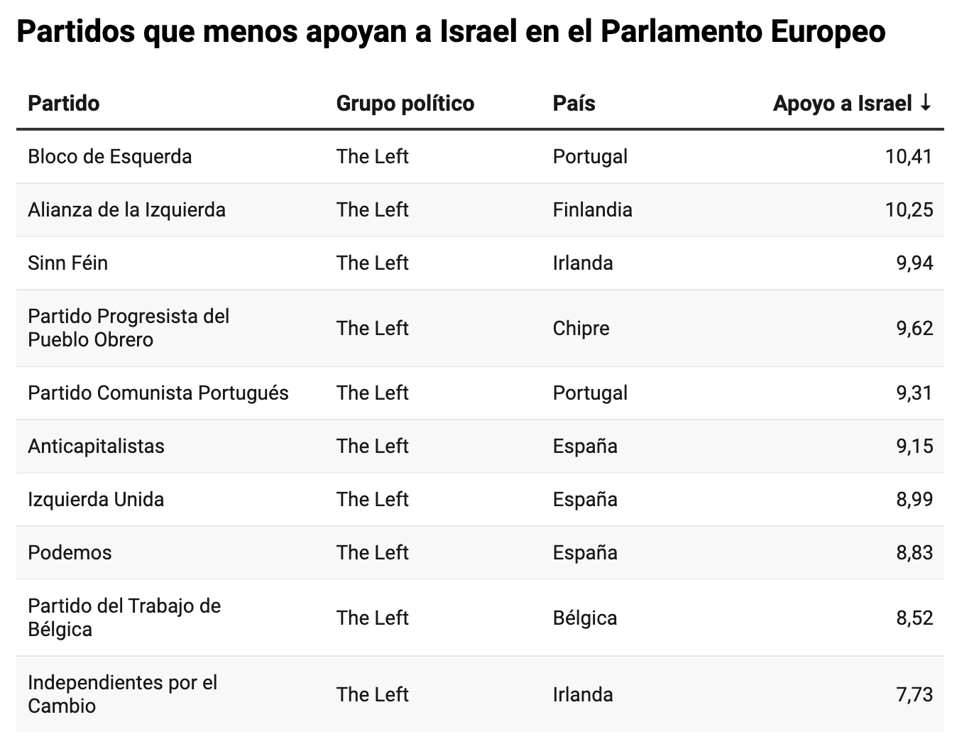 Este informe muestra, a modo de clasificación, que los 10 partidos del Europarlamento más afines a Israel pertenecen, todos ellos, a los dos grupos de la extrema derecha. El principal apoyo es el del grupo de los Conservadores y Reformistas (ECR), donde están Giorgia Meloni y Vox, entre otros. En esa familia se ubican ocho de los 10 partidos más proisraelíes. El grupo es aliado explícito del Likud, el partido del primer ministro, Benjamin Netanyahu.