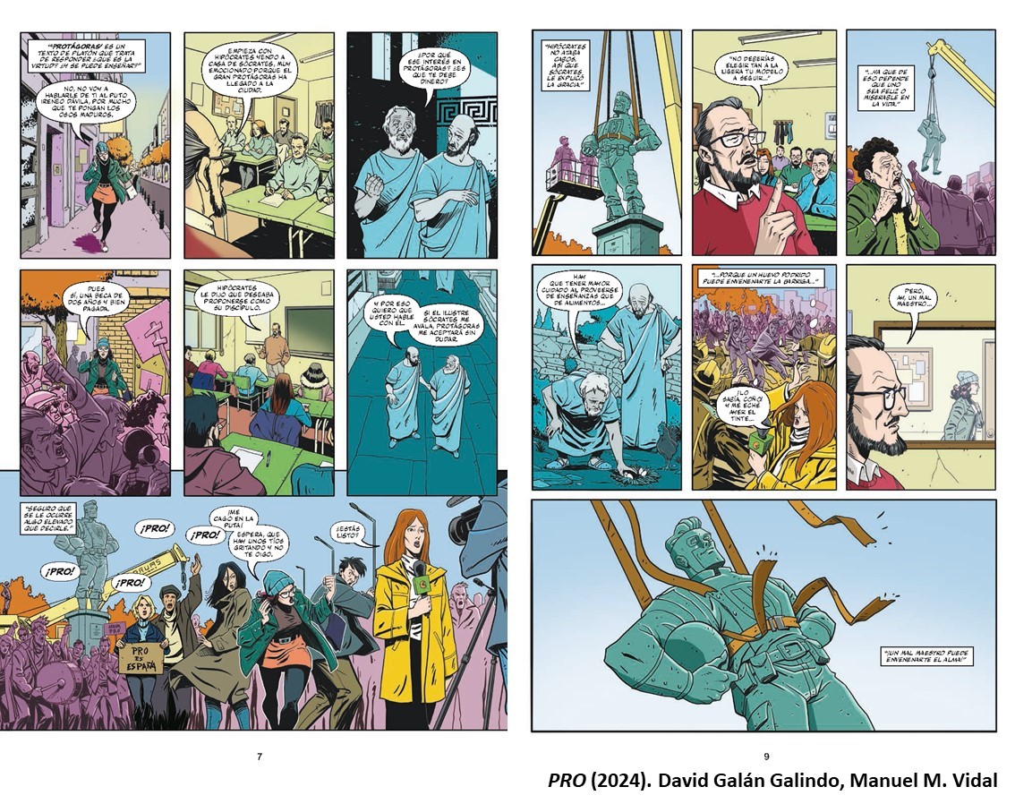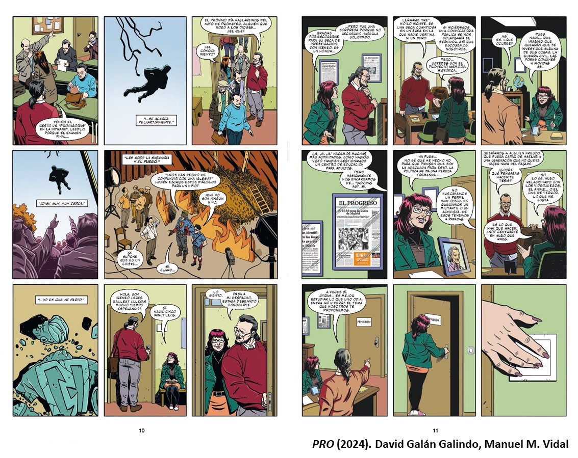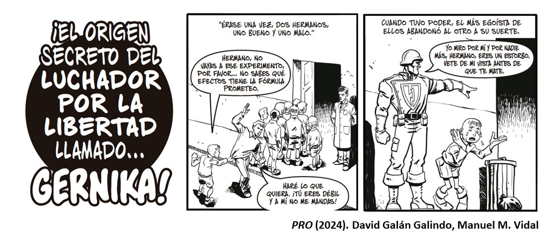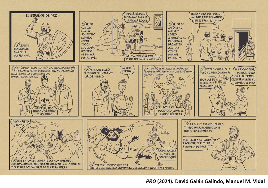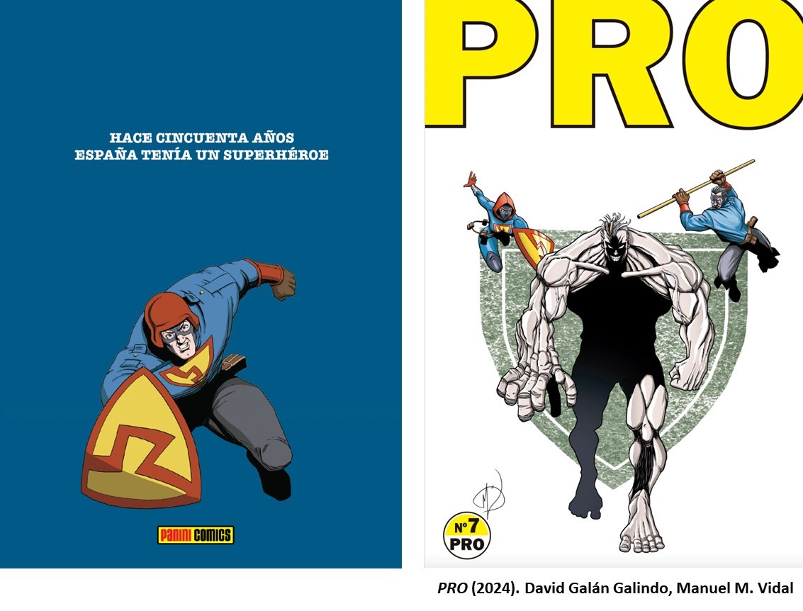 Esta premisa es el eje fundamental de la novela gráfica PRO (2024), con guion de David Galán Galindo y dibujo de Manuel M. Vidal (1972-2024), con color del propio Vidal y de Déborah I. Villahoz, y rotulación de Joseba Basalo, que en este cómic también es importante. De hecho, todo el conjunto es una obra maestra: en su concepción, con el objetivo de imaginar a un superhéroe autóctono, español, integrando su biografía en la historia real del país en los últimos ochenta años; en su plasmación, con un dibujante inspirado con un estilo camaleónico que se adapta a cada necesidad de las viñetas; y en su diseño, con una planificación sorprendente, unos recursos adicionales innovadores, un color que se adapta a cada estilo y época requerido, y una rotulación en consonancia, incluidas onomatopeyas ad hoc.