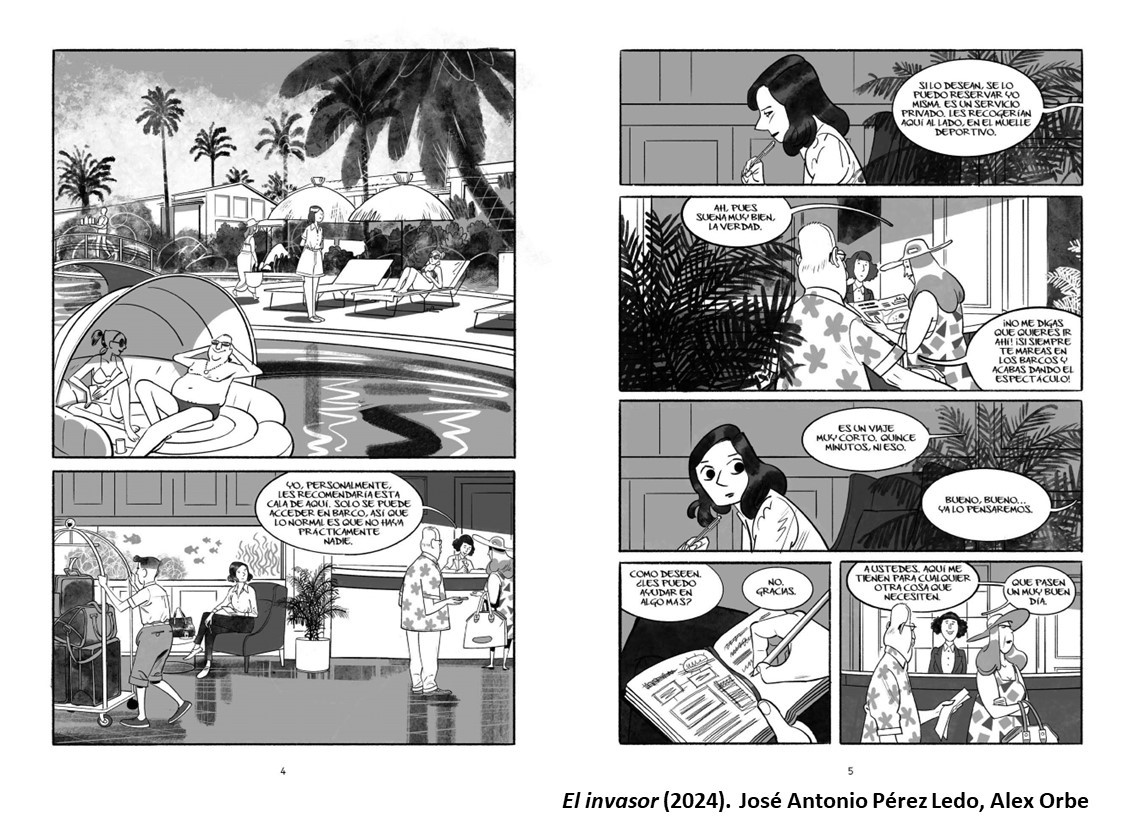 Astiberri Ediciones publica la novela gráfica El invasor (2024), con guion de José Antonio Pérez Ledo y dibujo de Alex Orbe, en la que en las primeras páginas nos muestran el día a día de Carol en un hotel de cinco estrellas, consumiendo todos los servicios… absolutamente todos. Más tarde, sabremos que las estancias por su trabajo oscilarán entre una noche y una semana, dependiendo de la cantidad de servicios que ofrezca la organización a analizar. Y que puede ser una profesión tremendamente «aburrida» (si puede decirse así), por su reiteración y, especialmente, por su soledad. De hecho, observamos una relación esporádica de Carol que ha de romper inmediatamente cuando la mujer con la que acaba de pasar la noche, empleada del hotel, descubre su verdadero trabajo al ver los sellos de su pasaporte. Porque el precio que hay que pagar por este trabajo es el de viajar continuamente, sin apenas tiempo de dormir en tu propia cama, en tu hogar. A no ser que haya una pandemia global, claro.