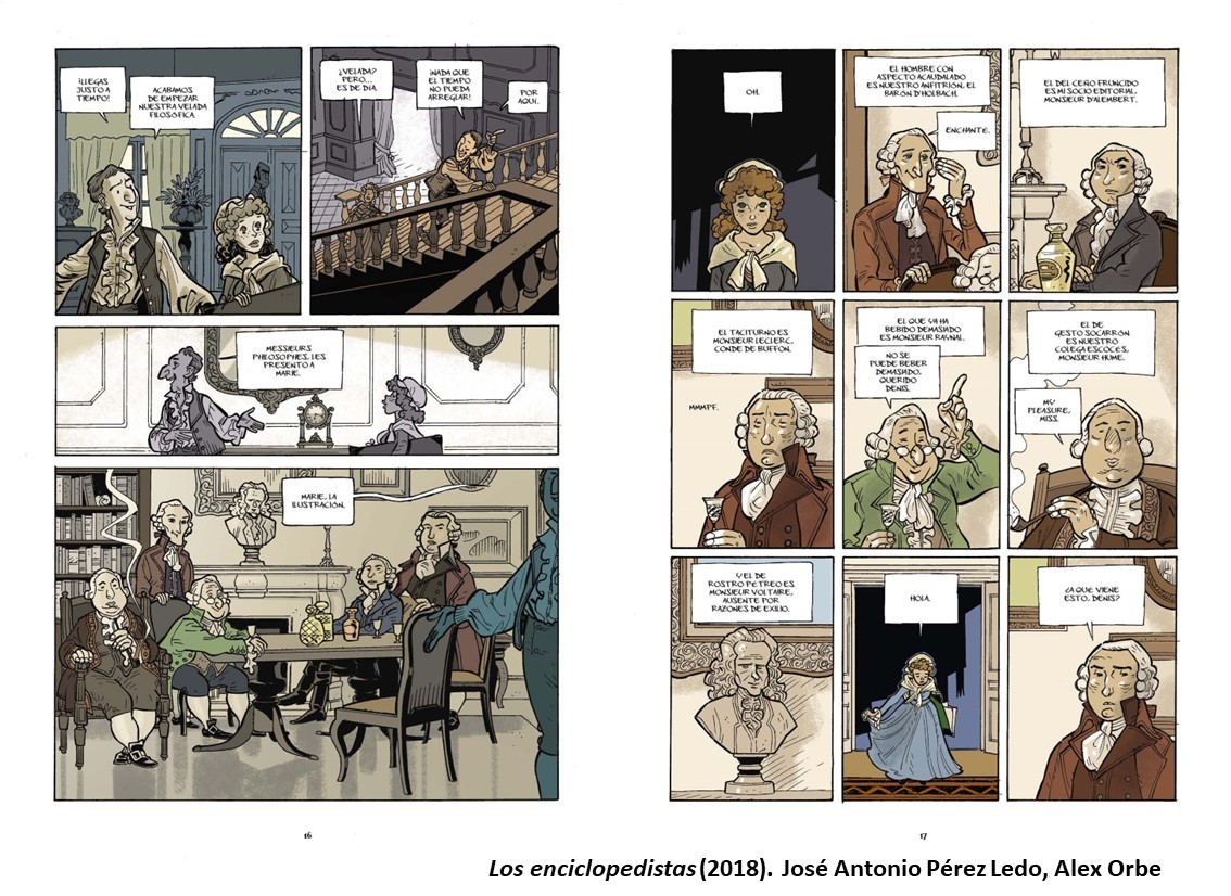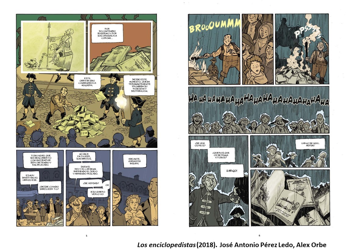 La historia de Los enciclopedistas acontece en 1750 en París, donde un grupo de intelectuales están decididos a producir una obra monumental, nada más y nada menos que L’Encyclopédie. Pérez Ledo y Orbe nos muestran el convulso proceso que supuso la génesis del conocido como el Dictionnaire raisonné des sciences, des arts et des métiers (Diccionario razonado de las ciencias, las artes y los oficios, 1751-1772), que sufrió las leyes del momento, en la Francia de la época previa a la célebre revolución, donde las opiniones antirreligiosas y antimonárquicas eran castigadas con la cárcel. En las primeras páginas de la novela gráfica contemplamos la quema de libros recogidos en el Index Librorum Prohibitorum (Índice de libros prohibidos, 1564-1948), que incluía una lista de aquellas publicaciones que la Iglesia católica catalogaba como heréticas, inmorales o perniciosas para la fe y que los católicos no estaban autorizados a leer y que, además, establecía las normas de la Iglesia respecto a la censura de los libros. Uno de los protagonistas del cómic, el mismísimo Denis Diderot (1713-1784), impulsor de L’Encyclopédie, afirma lo siguiente en una de las viñetas: «Es una guerra. La de la razón contra la superstición. La de la libertad contra el sometimiento. Nosotros no la hemos comenzado, pero estamos dispuestos a librarla».