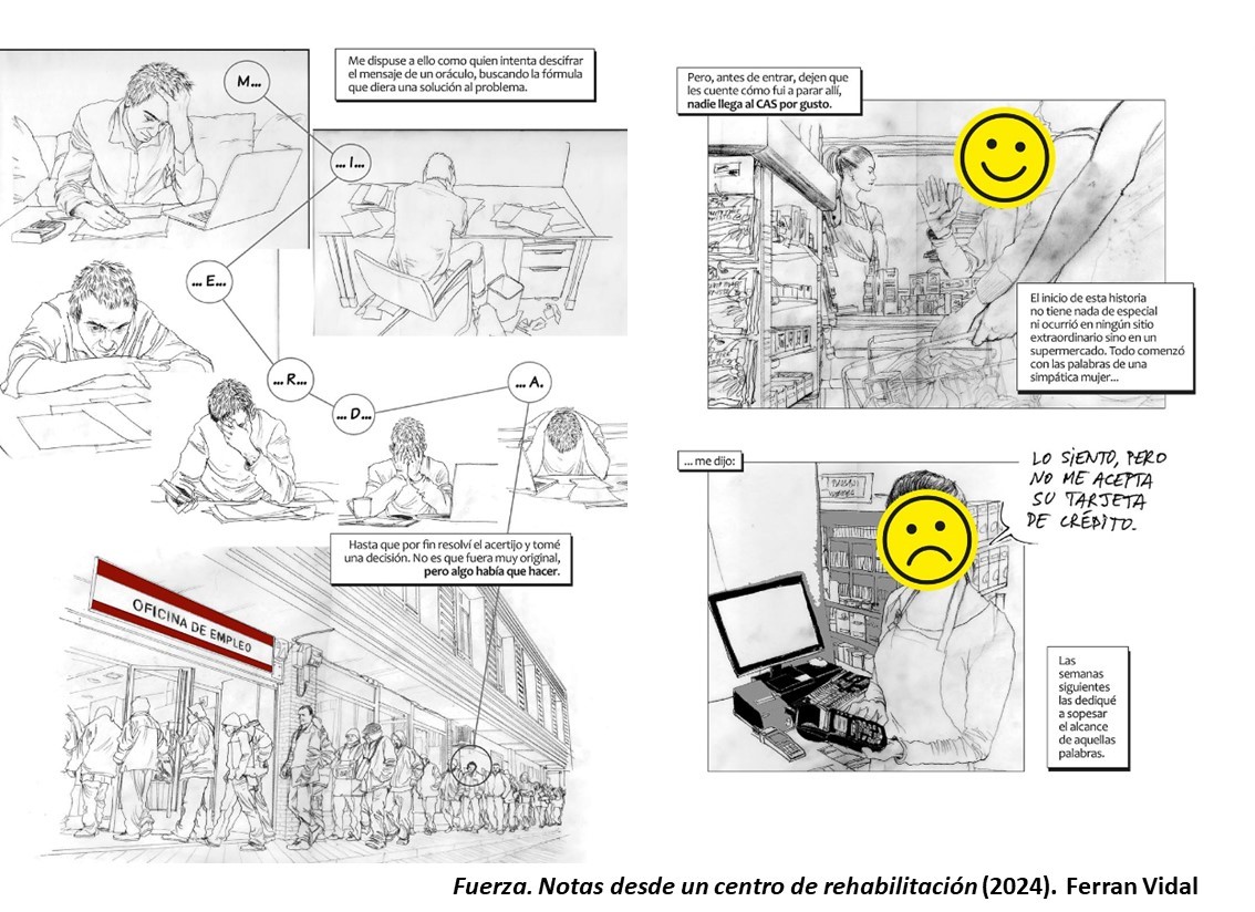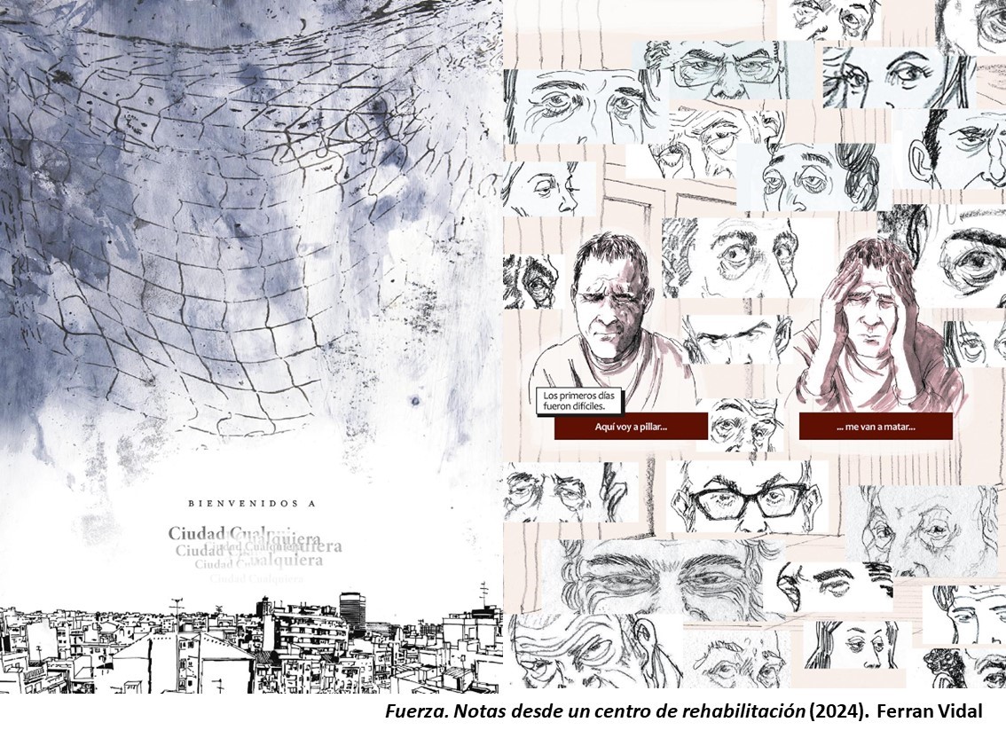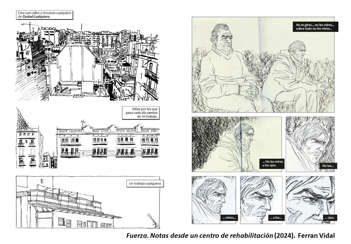 Ferran Vidal realiza un trabajo portentoso de documentación y de narración, combinando diversas técnicas que compaginan la historieta, la ilustración y la pintura, las tres especialidades que, junto a la escultura, son la base de su producción artística. Maneja el lápiz con un trazo expresionista extrañamente realista, con una composición de la página experimental en cada escena, con una gran carga pedagógica. Su valor artístico fue reconocido en su momento, el proyecto Fuerza. Notas desde un centro de rehabilitación le permitió a su autor ganar el VI Premio de Novela Gráfica Social Divina Pastora, en su edición de 2018 (sí, han leído bien, lo que da una idea del esfuerzo creativo y editorial y la dificultad que supone realizar y publicar una obra de este tipo en nuestro país). El premio, promovido por la Fundación Divina Pastora, tiene el objetivo de fomentar la concienciación ciudadana a través del dibujo en la novela gráfica como medio artístico de expresión.