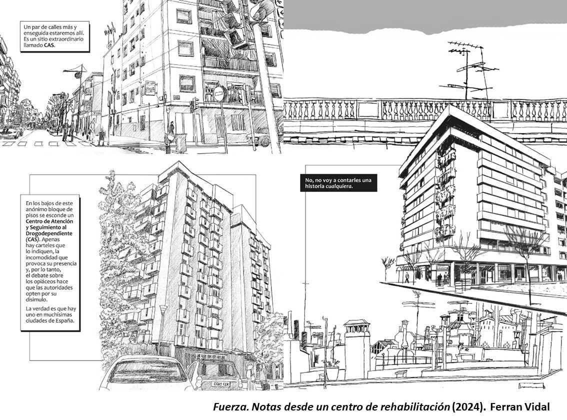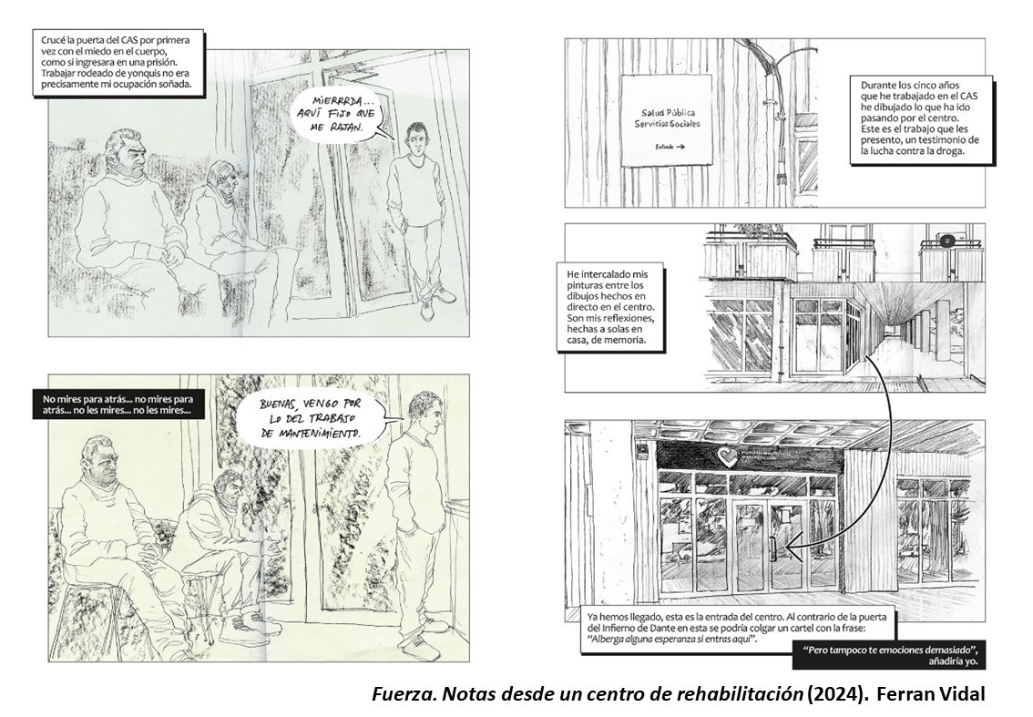 Norma Editorial publica la novela gráfica Fuerza. Notas desde un centro de rehabilitación (2024), con guion y dibujo de Ferran Vidal, un trabajo de documentación exhaustivo sobre el funcionamiento y las personas que interactúan en un Centro de Atención y Seguimiento (CAS) a las drogodependencias, en el que el mismo autor sitúa en «una ciudad cualquiera». La obra funciona como un documental, con la descripción de la instalación y de las funciones de la institución, la especificación del personal y la descripción somera de sus puestos de trabajo, y una breve presentación, en algún caso con una minientrevista, de muchas de las personas que pasaron por el centro a lo largo de los cinco años en que Vidal trabajó en el CAS, siendo él mismo parte del relato, como hilo conductor de la narración en primera persona.