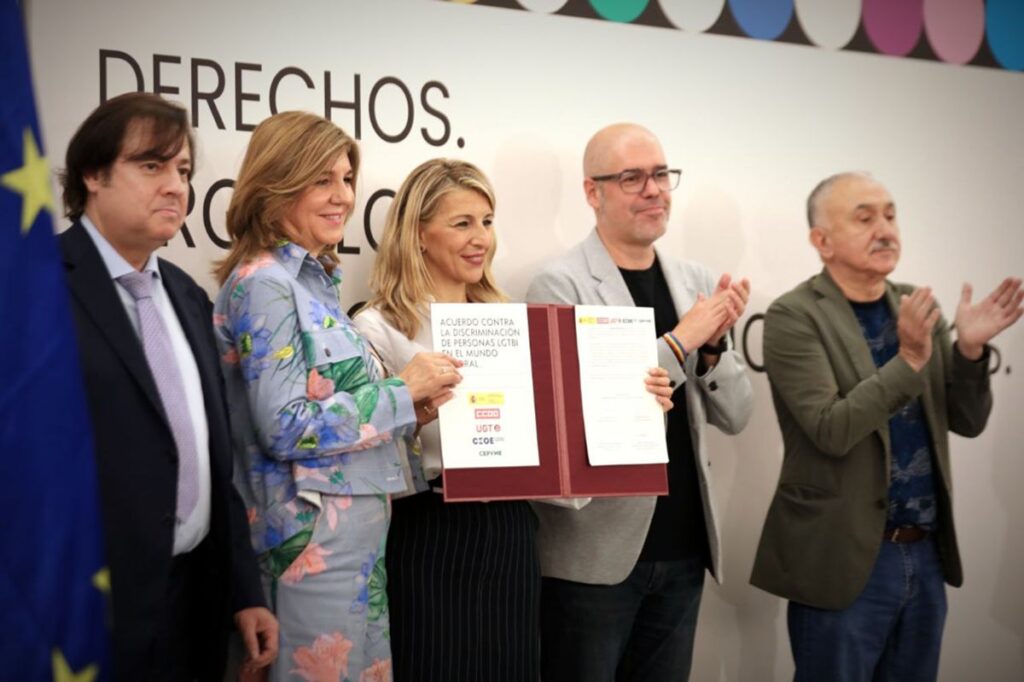 El ministerio de Trabajo y los agentes sociales han firmado un acuerdo tripartito para acabar con la discriminación del colectivo en el ámbito laboral. Las empresas de más de 50 trabajadoras tendrán que establecer medidas que garanticen la igualdad real y efectiva de las personas trans y los derechos de las personas LGTBI, además de la creación de un protocolo contra el acoso y la violencia, que incluya mecanismos de prevención, detección y actuación. El texto incluye la necesidad de incorporar formación para la igualdad y la no discriminación. Aunque las obligaciones se contemplan para empresas de medio centenar de personas, el plan pretende ir mucho más allá. Las compañías y sectores con convenios colectivos tendrán que abrir procesos de negociación con los sindicatos para incluir las medidas pactadas. La ley 4/2023 por la igualdad trans y LGTBI ya incorporaba en su artículo 15 la obligación de que las empresas de más de cincuenta trabajadores tuvieran medidas planificadas para generar climas de inclusión y respeto. También para los casos de acoso o violencia. La ministra de Trabajo, Yolanda Díaz, ha insistido en la firma del acuerdo, en la necesidad de “erradicar estereotipos en el acceso al empleo de las personas LGTBI”. El plan también incluye un protocolo específico de acompañamiento a las personas trans, una de las principales reivindicaciones del colectivo. Todas las partes reconocen que se trata de un punto de partida que ahora es necesario desarrollar en las empresas y en procesos de negociación colectiva.