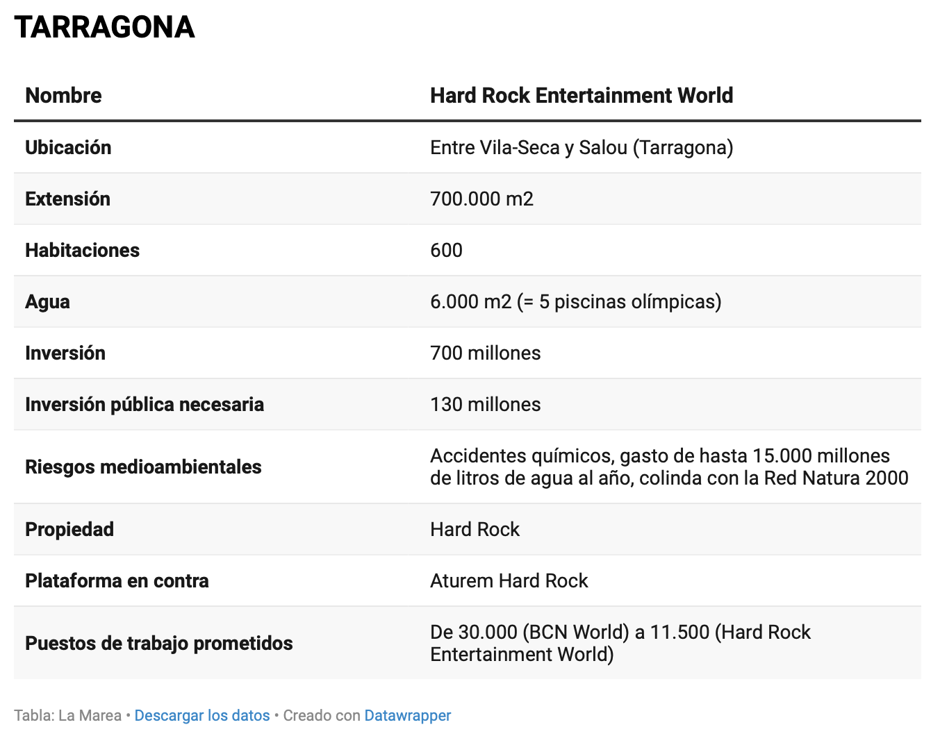 Además de los 11.500 puestos de trabajo prometidos, el casino también asegura consecuencias devastadoras para la zona; por ejemplo, riesgo de accidentes químicos (como ya sentenció el Tribunal Superior de Justicia de Catalunya) o una piscina del tamaño de cinco olímpicas en un momento crítico por la sequía en la zona. Ni siquiera cumple con los requisitos mínimos ambientales, según un informe del Departament d’Acció Climàtica de la Generalitat de 2022. Todos estos impactos se han trasladado también a la política: las resistencias de los partidos a apoyar o a renunciar al Hard Rock desembocaron este año en un adelanto electoral en Catalunya.