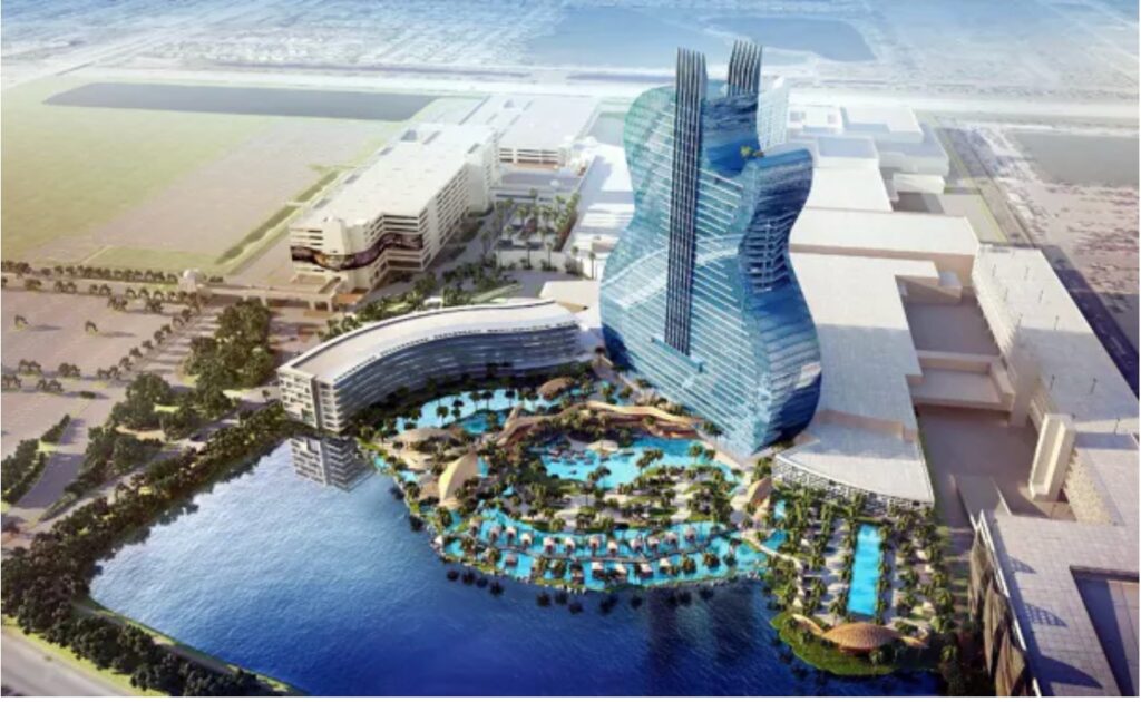 Hace años que la sombra de una ‘macro-guitarra’ se cierne sobre Vila-seca y Salou. Un instrumento gigantesco de más de 30 plantas y 600 habitaciones. Un hotel que coronaría un complejo de 700.000 metros cuadrados que contaría con otro hotel más, un casino, un centro comercial, un recinto para 15.000 personas y una mega piscina de 6.000 metros cuadrados. Esta era la versión reducida que propuso la empresa norteamericana Hard Rock. La primera opción, que data de 2012 y tenía reminiscencias del frustrado Eurovegas que se proyectó en Madrid, contemplaba hasta seis parques temáticos que replicaban, por seis, esta infraestructura.