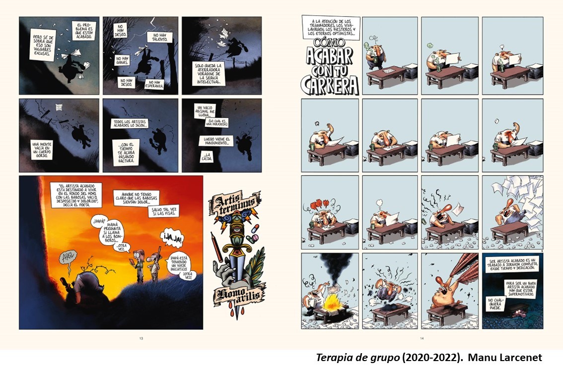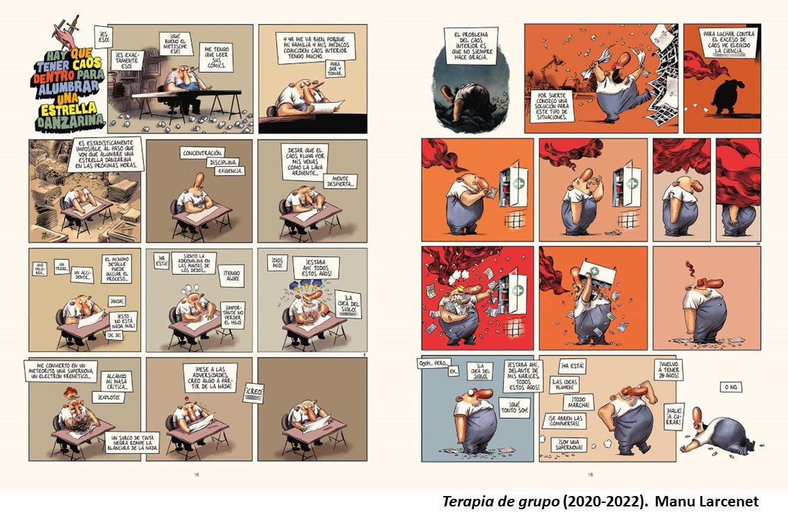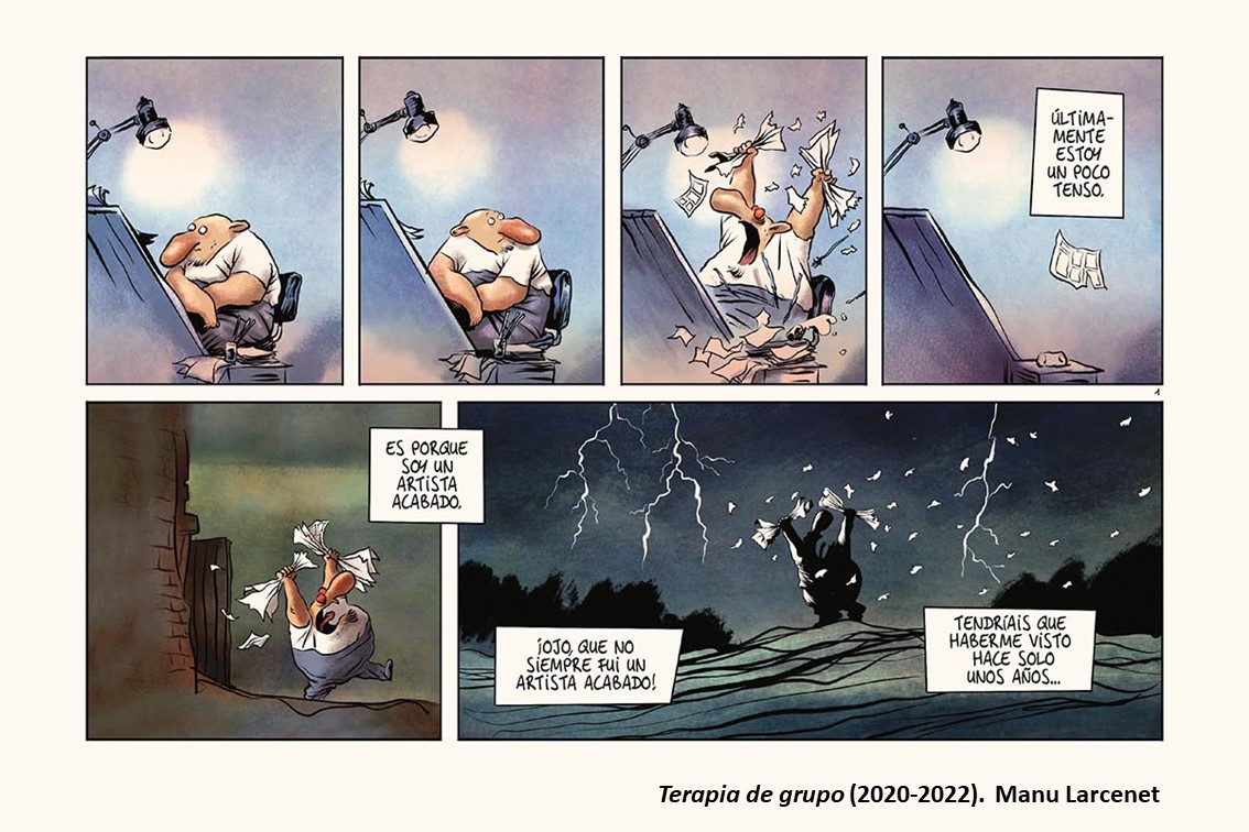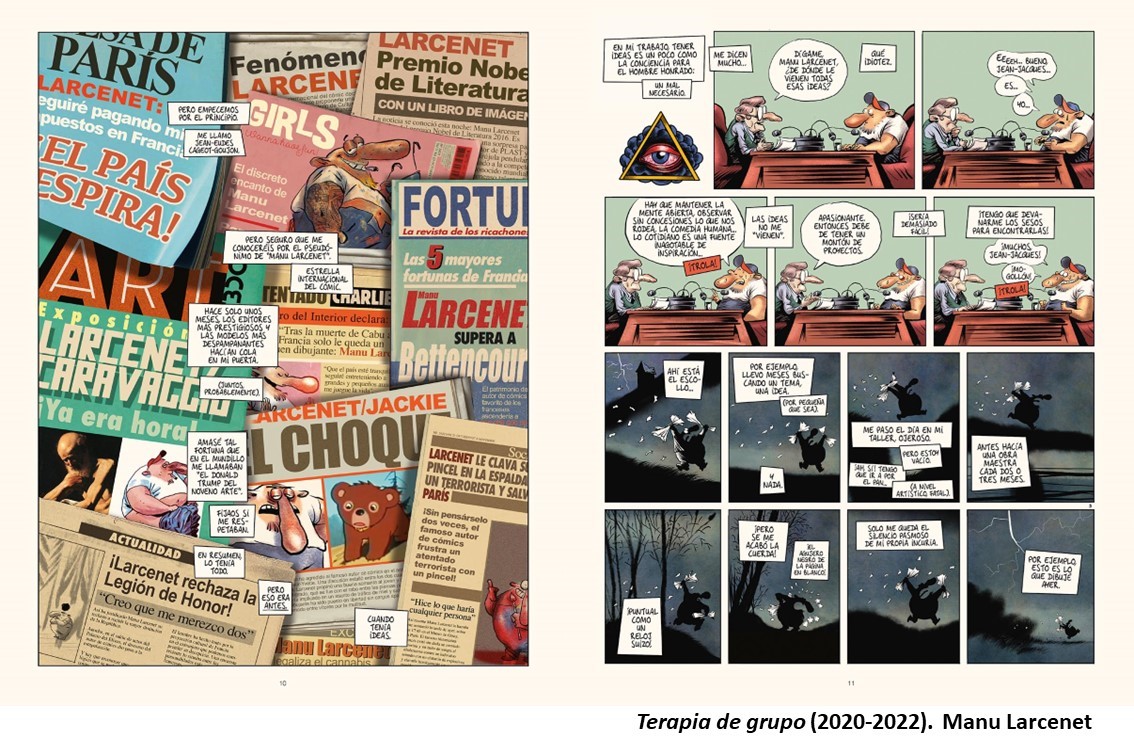 Manu Larcenet és una gran estrella internacional amb una prolífica obra singular, amb tota mena de gèneres, que un dia es va quedar bloquejat, o potser espantat per la pàgina en blanc (és a dir, leucosel·lofòbia o síndrome de la pàgina en blanc o també conegut com a síndrome del bloqueig) de l’escriptor). L’obra completa d’Una terapia de grupo és un viatge pel procés de recerca de l’autor que era, és alhora una representació de tota l’experiència viscuda, i una manera de desembussar la crisi de creativitat (encara que estem anticipant el final del còmic). Una lectura recomanada per a totes les persones que així ens hem sentit en algun moment de la nostra vida.