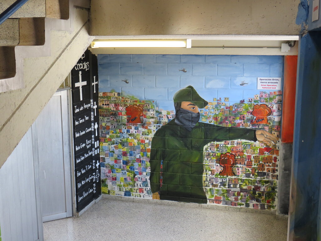 Em reben el director, Manuel Antonio López Ramírez, i el professor Carlos Arturo Jaramillo. Arribo en el moment exacte al millor lloc per conèixer qualsevol comunitat educativa: l’esbarjo. Nenes i nens juguen junts amb cordes i pilotes envoltats de grafitis que donen la pista. Els murs d’aquest col·legi s’erigeixen sobre la memòria històrica i la lluita social.