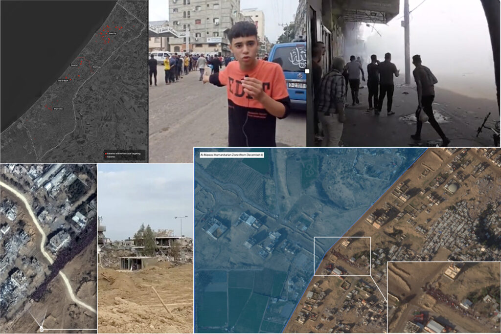 Entre octubre y principios de noviembre, Forensic Architecture ha documentado la destrucción de diecisiete panaderías en Gaza. En algunos casos, como el de la panadería Al Sharq, una bomba cayó al lado de la panadería mientras la gente hacía cola, hiriendo a varios civiles. En otros, como el de la panadería Al Jadeed, el objetivo fue directamente la panadería, matando a varias personas y dejando un cráter donde antes hubo un edificio.
