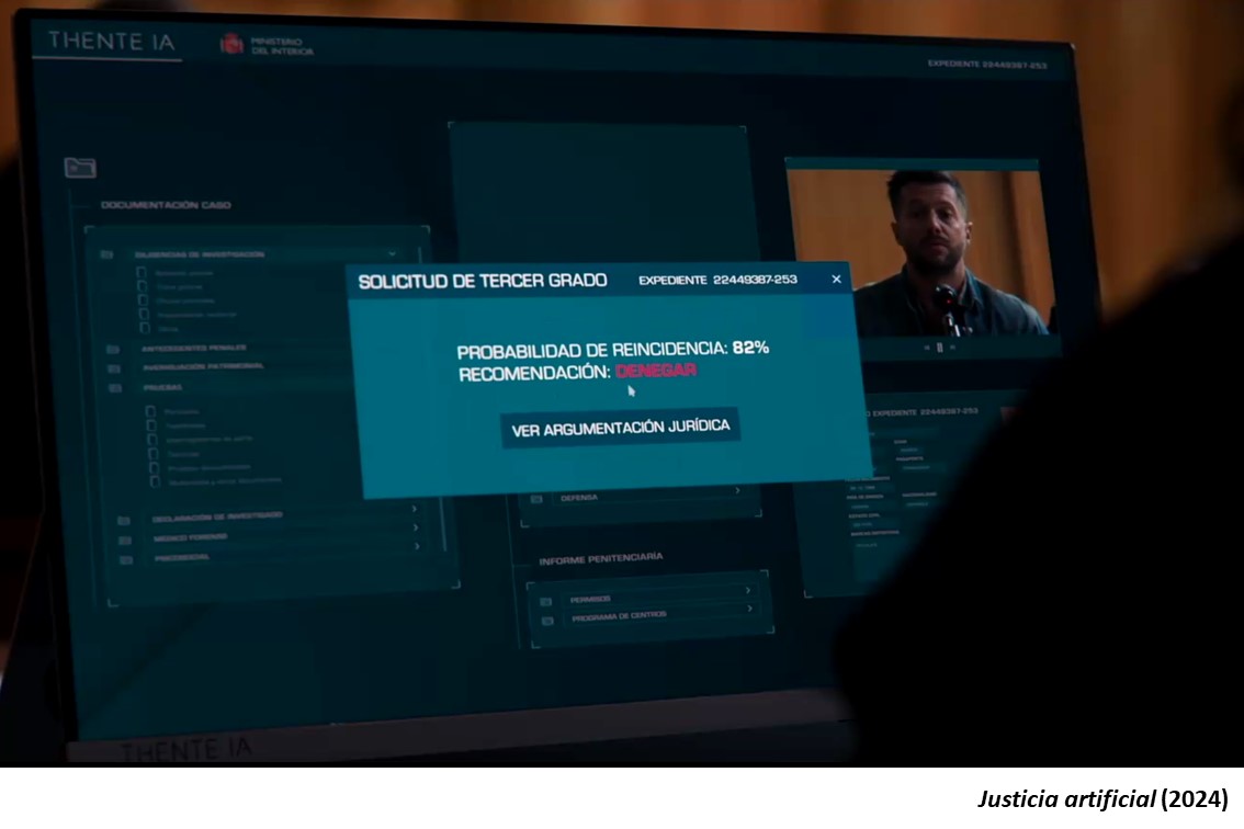 En Justicia artificial se plantea precisamente esa situación ante lo que denomina como «código ético», que no es más que extender unos privilegios determinados en las decisiones automáticas de vehículos autónomos. Y, a su vez, planta la duda ante la posibilidad de que se pueden realizar sentencias con el uso de inteligencia artificial. En uno de los instantes de la película, el representante de la empresa que ha desarrollado la aplicación informática que ha adquirido el gobierno español, realiza la siguiente defensa de los algoritmos desarrollados: «Cuando eliminas del proceso los condicionantes humanos como la ideología, la emocionalidad, los sesgos de raza, de género o de clase, cuando las sentencias que produces carecen de estos prejuicios, el ciudadano las percibe más justas, esto es lo que nos dicen nuestros indicadores y esto es lo que consideramos como una justicia de mayor calidad».