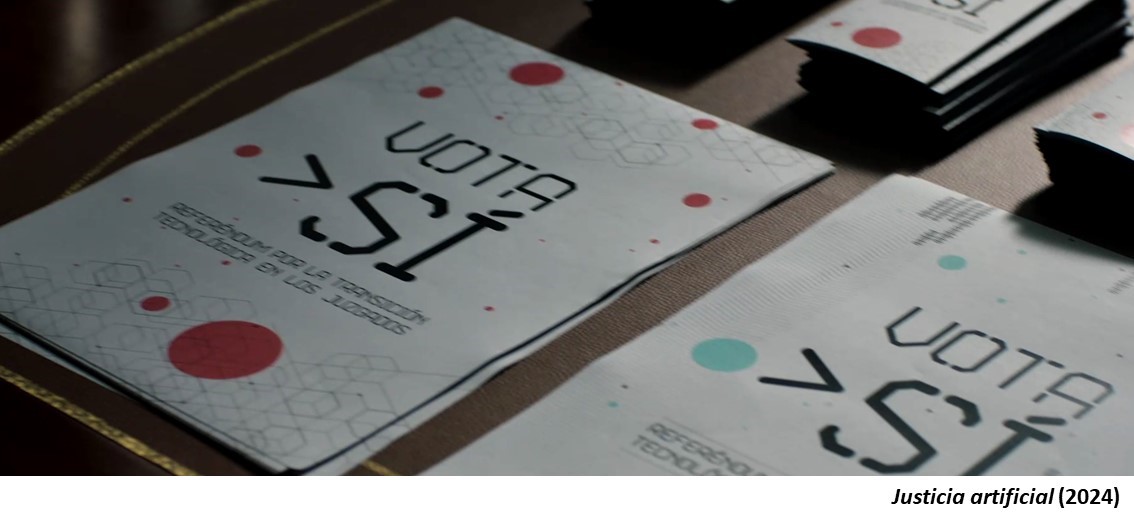 Alfonso Bueno López finaliza su análisis en el año 2023 para que el libro llegara a las librerías en mayo del siguiente año, apenas cinco meses después, por lo que no incluye la película estrenada en septiembre, cuatro meses después de la publicación del libro, casi al final del verano, y que podría perfectamente iniciar un nuevo capítulo en una futura edición que recopilase las siguientes producciones del género analizado. Nos referimos a la película Justicia artificial (2024), dirigida por Simón Casal, que coescribe el guion junto a Victoriano Sierra Ferreiro, y que está protagonizada por Verónica Echegui, Alba Galocha, Alberto Ammann y Tamar Novas, una ficción que plantea la posibilidad de que en España se organice un referéndum para que la población pueda aceptar o no que se realice una transición tecnológica de los juzgados, hasta el punto de que se permitiese que las sentencias fuesen escritas por un programa informático, una inteligencia artificial que lleva el nombre de THENTE en la ficción.