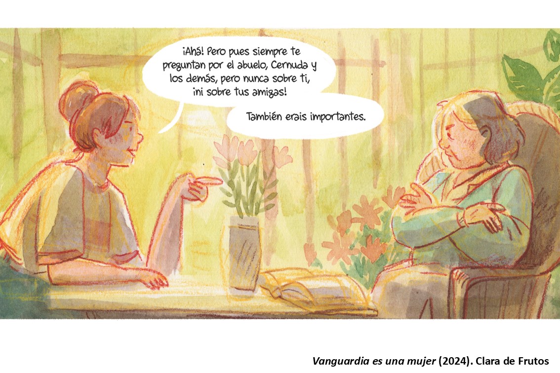 Al còmic Vanguardia es una mujer apareix l’escena de l’arribada de Rafael Albertí després de l’exili, el 27 d’abril del 1977, quan tots els mitjans de comunicació envoltaven l’autor, protagonitzant totes les portades dels diaris i dels noticiaris a la televisió… mentre que els periodistes ignoraven la seva parella que l’acompanyava al mateix viatge, la també escriptora María Teresa León (1903-1988). Una més de les autores invisibilitzades. «Mentre els seus companys de generació i de vida eren distingits, reconeguts i popularitzats, elles i la seva obra eren oblidades o la seva transcendència històrica se centrava en el fet de ser dones de, sent molt pocs els casos en què se les va considerar per si mateixes», escriu Tània Balló al pròleg del còmic de Clara de Frutos. Balló ha estat una palanca fonamental en la tasca de recuperació de la memòria d’aquestes autores, i, a més, de fer-ho d’una manera pedagògica. Al final del documental Las sinsombrero de 2015, veiem com el professor de literatura de l’esmentada classe d’ESO recull els exàmens dels alumnes un cop acabat el temps de la prova, però no el de les alumnes. Les cares de sorpresa i incredulitat de tota la classe és una imatge perfecta del que significa invisibilitzar les dones. La representació de gènere importa i és crucial per a la nostra societat.