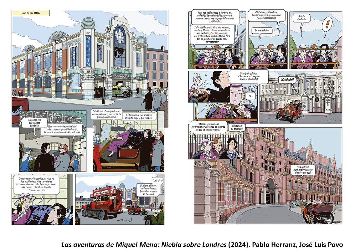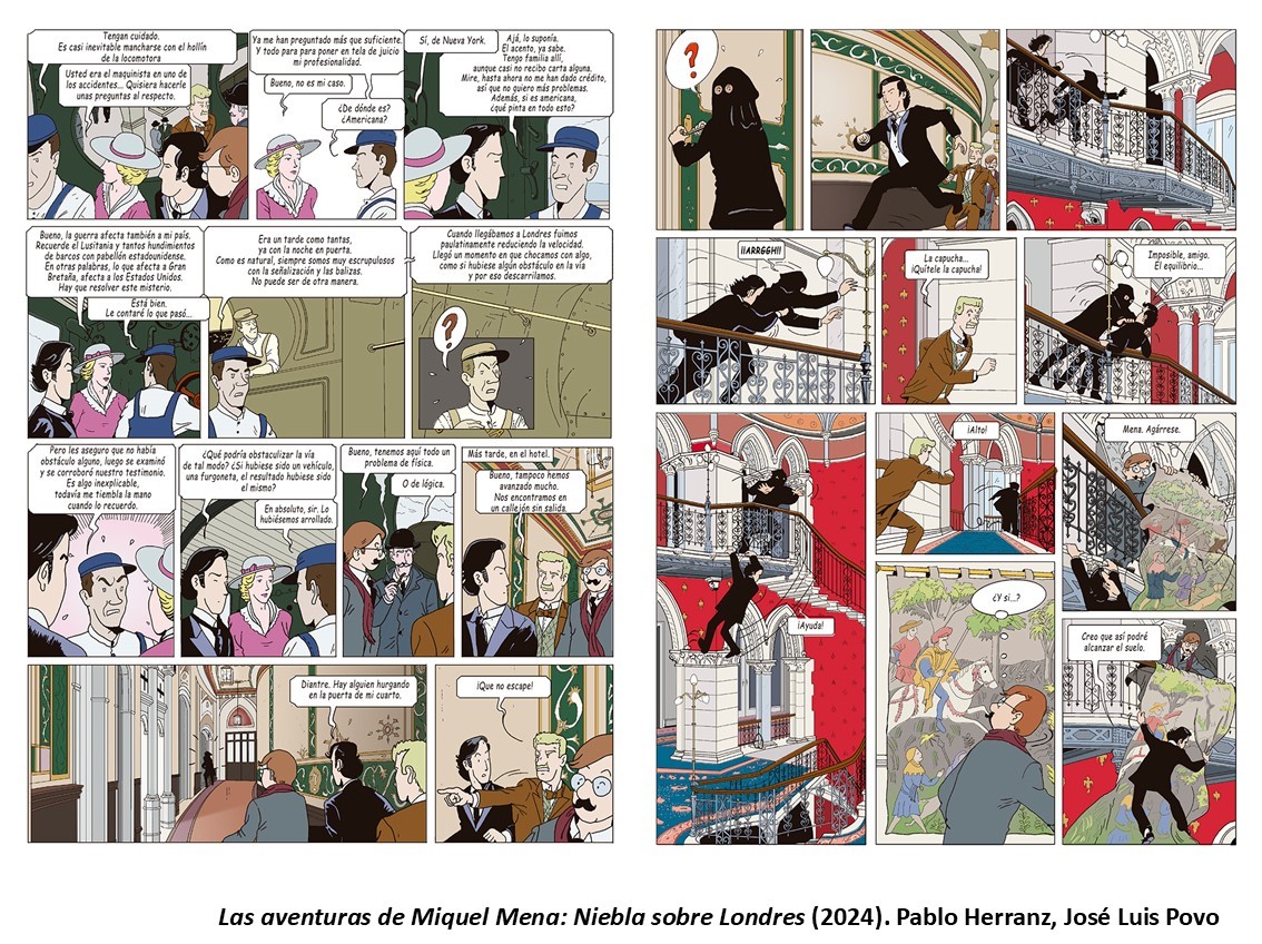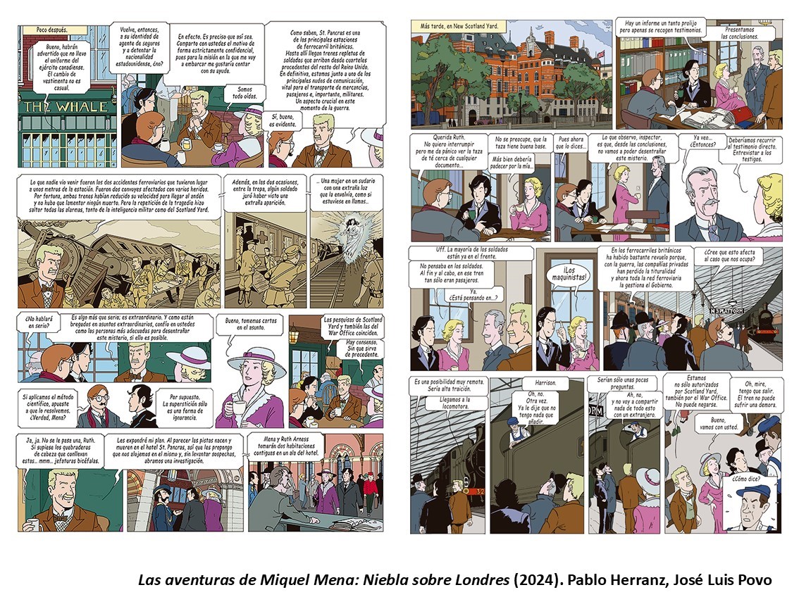 El tercer número de la trilogia ha trigat gairebé una dècada a produir-se, i ha estat, finalment, mitjançant un micromecenatge aconseguit dos anys abans, gràcies, a més, de poder editar-lo en castellà i francès (finalment, està disponible la trilogia completa en francès), el que permetia realitzar un tiratge raonable. El títol que tanca aquest bloc és Las aventuras de Miquel Mena. Niebla sobre Londres (2015), en aquest cas, amb la tinta i, de nou, amb el color d’Estrella Povo. Herranz reconeix que en escriure el guió d’aquesta història es va inspirar en dues pel·lícules clàssiques britànica, com són ¡Oh, señor Porter! (Oh, Mr. Porter!, 1937) i El tren fantasma (The Ghost Train, 1941), que, alhora, es basaven en les representacions teatrals de l’època. Aquest misticisme característic de la dècada, amb els clàssics mèdiums, permet introduir un toc fantàstic a la narració, sense oblidar el misteri i l’aventura, intensificada després de l’assassinat del mestre de la Gran Lògia a Londres, al mític Hotel Saint Pancras, amb uns dibuixos fabulosos de l’exterior i l’interior de l’edifici. Si el transport marítim i l’aviació protagonitzaven les dues històries anteriors, en aquesta ocasió el ferrocarril serà fonamental a la trama, sense oblidar els llegendaris cotxes que ens evoquen sempre una època molt concreta. Per cert, part del conflicte es genera a partir d’una decisió real, quan el govern britànic va decidir nacionalitzar la xarxa de ferrocarril a conseqüència de l’esclat de la guerra.