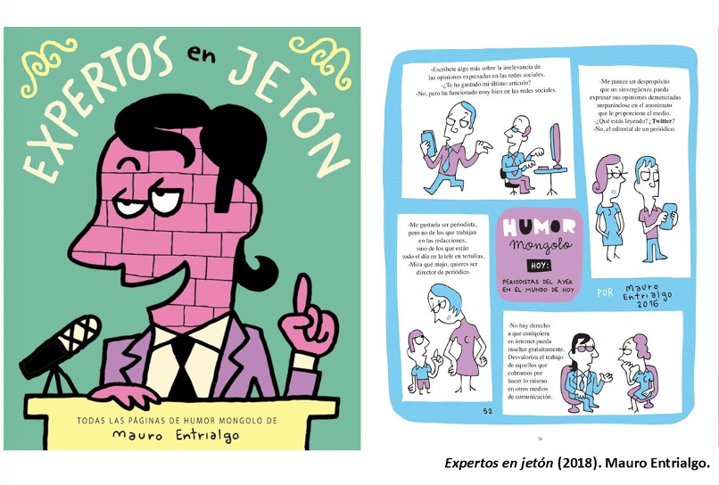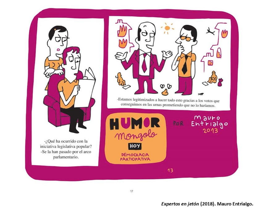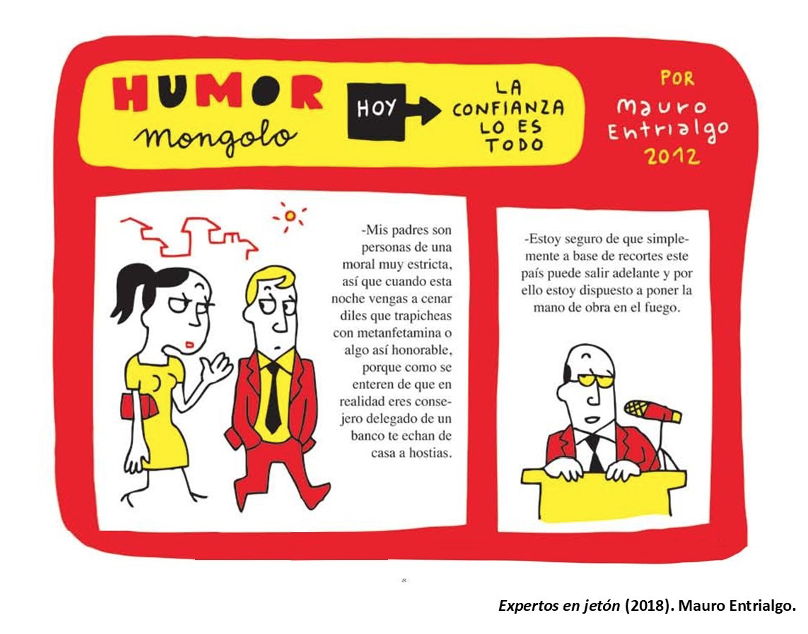 Ese terrible momento, que debería de atemorizarnos al pensar el peligro que puede entrañar que la persona más poderosa de la Tierra sea un desalmado, en realidad produce risa. De hecho, se ha convertido en un meme, mostrando la sonrisa cruel del personaje, ante la evidencia de que un acto delictivo de esa magnitud es aplaudido por la muchedumbre. Esta icónica escena aparece descrita en el libro Malismo. La ostentación del mal como propaganda (2024), de Mauro Entrialgo, publicado por la editorial Capitán Swing. Entrialgo es un polifacético artista, guionista de cine y teatro, músico, ilustrador y dibujante de historietas, colaborador de diferentes medios de comunicación desde hace más de tres décadas, y con más de cincuenta publicaciones, muchas de ellas recopilatorios de sus colaboraciones en diferentes revistas, como Expertos en jetón (2018), publicado por Diábolo Ediciones, que, a su vez, recopilaba las páginas de la sección Humor Mongolo que aparecían en la revista Mongolia (2012-). Recientemente, ha publicado el interesante Diccionario ilustrado BOE-español (2021), junto a Eva Belmonte, una herramienta pedagógica para entender el lenguaje administrativo del Boletín Oficial del Estado. Desde el año 2000 publica de forma ininterrumpida en la revista El jueves (1977-) una página del personaje Ángel Sefija, un escritor frustrado que el autor utiliza como cronista y crítico de la sociedad contemporánea, y cuyos recopilatorios los publica la editorial Astiberri.