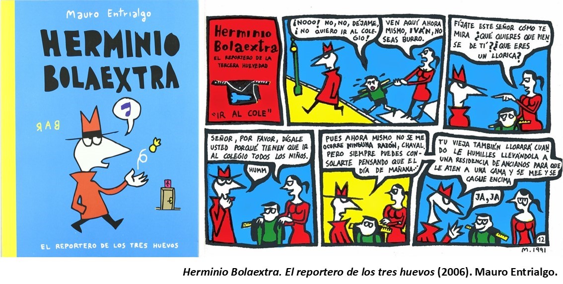 Mauro Entrialgo creó en 1987 una historieta para la revista bimestral TMEO que, a lo largo de los años, se ha convertido en el único personaje que ha aparecido en sus páginas de forma ininterrumpida desde entonces, con un apodo elocuente. Herminio Bolaextra es un periodista que siempre viste con un sombrero y una gabardina, y que tiene el sobrenombre con el que, precisamente, el autor tituló una de sus recopilaciones: El reportero de los tres huevos (2006), publicado por Ezten Kultur Taldea, la editorial responsable de la publicación de la revista. Bolaextra también es el protagonista, entre otros, de Cómo convertirse en un hijo de puta. La enciclopedia del mundo de Herminio Bolaextra (2004), publicado por la Editorial Astiberri, en la que la nota de prensa lo describe así: «Herminio Bolaextra es, por motivos de supervivencia, redactor de tercera fila del periódico amarillista El Caos. Adicto al Ricard, entusiasta del tequila y amigo de la jarana, dedica la mayor parte de su existencia a su pasatiempo favorito: el gamberrismo prácticamente indiscriminado. Sólo nos queda la locura y Herminio lo sabe cuándo pasea por la calle con el gesto impasible y el miembro empalmado marcando bultaco bajo su eterna gabardina». Con un currículum como este, Entrialgo sorprende al lector al final de su ensayo Malismo, al afirmar que se está planteando matar a su legendario personaje: «La incorrección tiene ya poca gracia como broma, porque la incorrección ha sido asimilada por los poderosos y es ya una de sus armas recurrentes». Si realmente es el final del personaje, añoraremos la lucidez de Herminio puesto que, en cierta manera, fue un visionario adelantado a su tiempo.