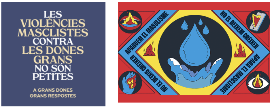La Generalitat de Cataluña en 2021 impulsó la campaña “Las violencias machistas contra las mujeres grandes no son pequeñas. A grandes mujeres, grandes respuestas” (Imagen 2), la cual tenía la finalidad de dar visibilidad a las violencias que sufren las mujeres, que, a menudo, son invisibilizadas. O la campaña realizada por el Ayuntamiento de Barcelona en 2021, “Apaguemos el machismo, no lo dejemos crecer” (Imagen 3), que subrayaba la necesidad de toda la sociedad de trabajar para erradicar las VM, animando a los hombres a construir modelos de masculinidad libres de violencias. El hecho que estos dos carteles no tengan imágenes de personas, ni para ilustrar a la víctima o al perpetrador y pongan el énfasis en el texto, contrasta con las anteriores campañas, permite abrir un nuevo imaginario sobre la conceptualización de las VM que ayuda a romper con los estereotipos anteriormente especificados. También hay que destacar que en la Imagen 1, la responsabilidad se traslada del individuo a la sociedad con mensajes generalistas, sin que queden claras las obligaciones, en cambio, en las imágenes 2 y 3 se apela a responsabilidad colectiva y se trasladan las VM al ámbito público, para dejar de mantener su gestión en el ámbito privado. Este hecho es extremadamente relevante, puesto que pone de manifiesto la idea de que no ha de haber una complicidad social y un silencio ante las VM.