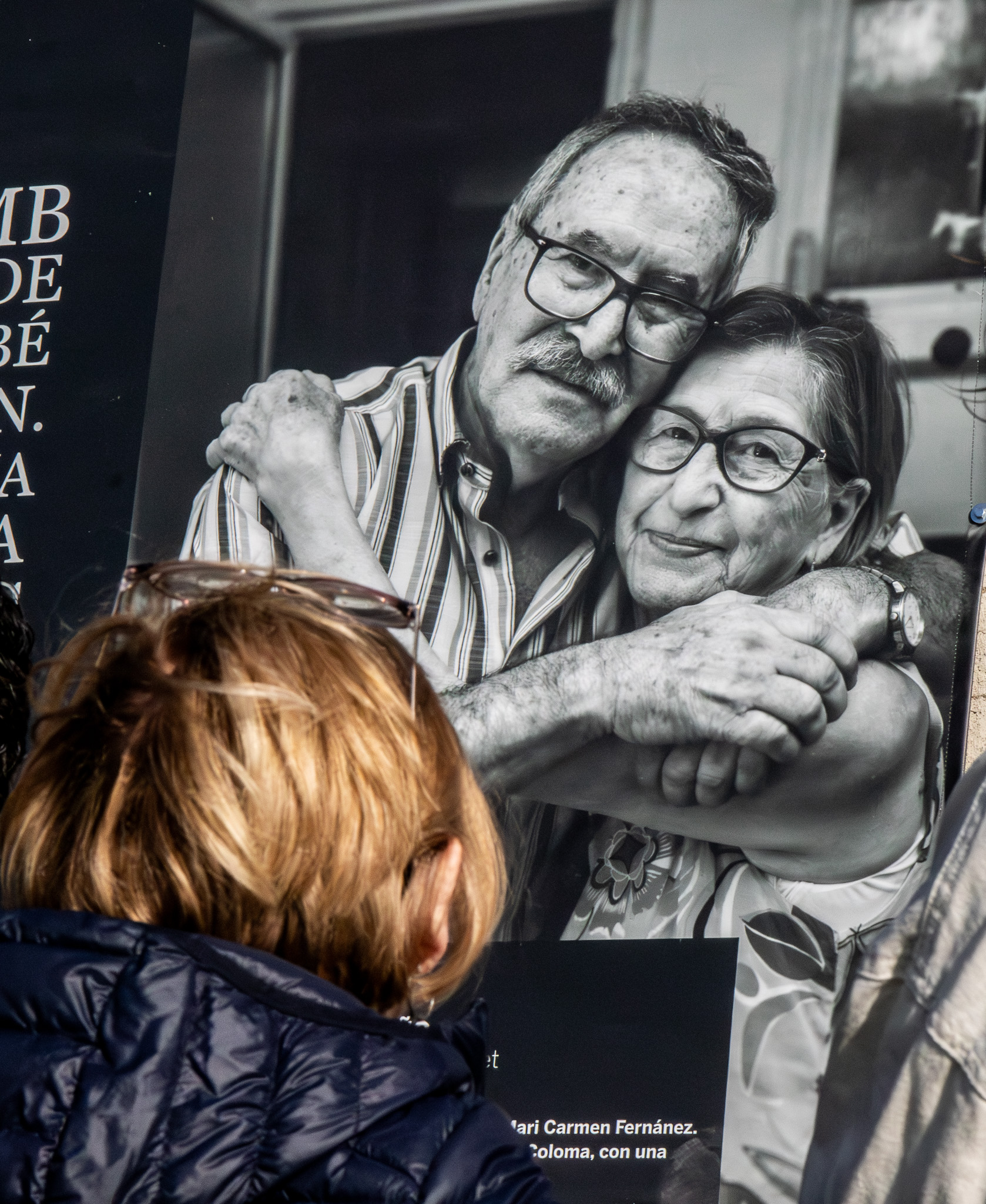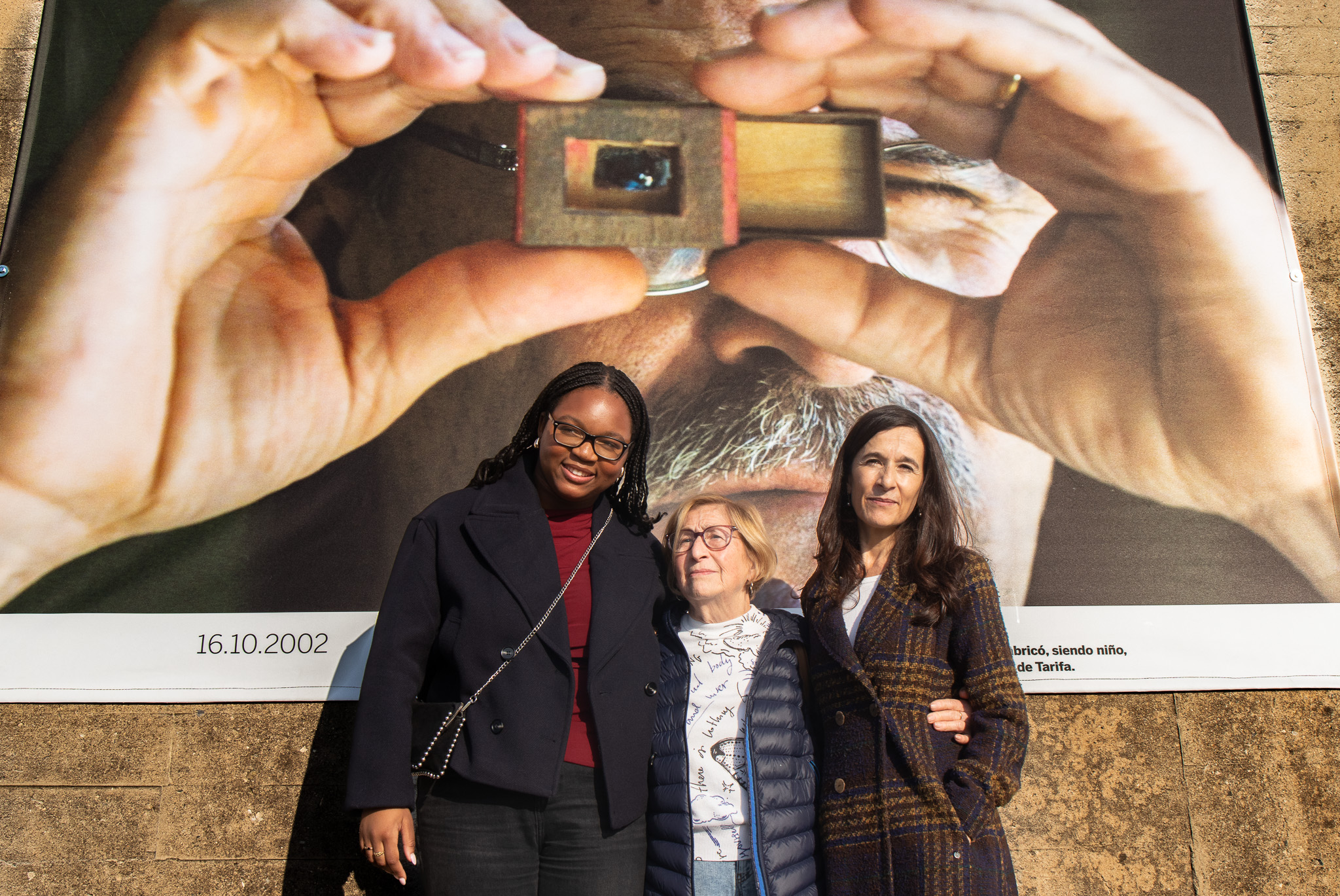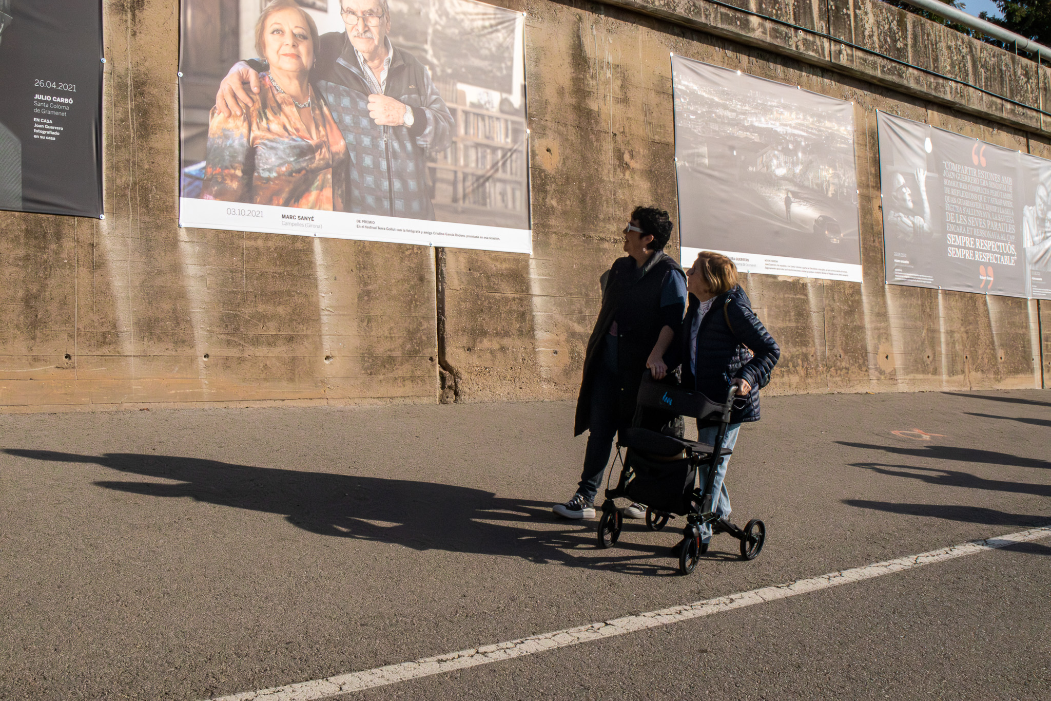 La esposa y las hijas de Joan Guerrero, delante de una de las fotos de la exposición al aire libre en Santa Coloma de Gramenet. | Pol Rius