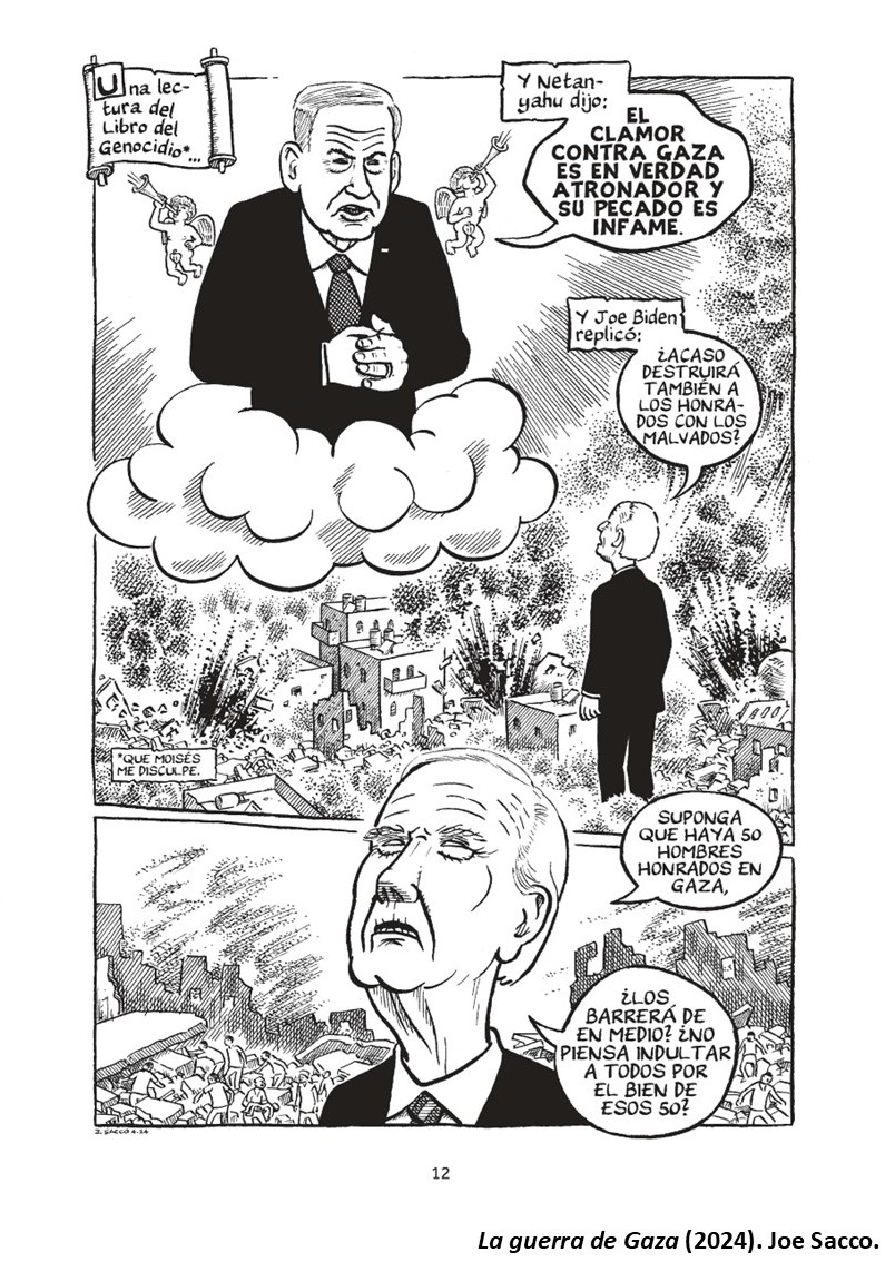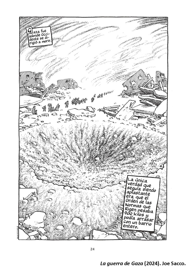 «Quin horror… ¡Gent vivint a tendes de campanya!… ¡Vivint a la misèria!… ¡Ja no tenen casa!… ¡Ni lloc on endreçar-se o fer les seves necessitats!… ¡Gairebé sense menjar!… ¡Sense saber què els oferirà el futur!… ¡Detestats per un món cruel que preferiria veure com desapareixen!», aquest text correspon a una vinyeta de l’últim còmic de Joe Sacco, La guerra de gaza (The War on Gaza, 2024), publicat en castellà per Reservoir Books, amb traducció de Montse Menesos.