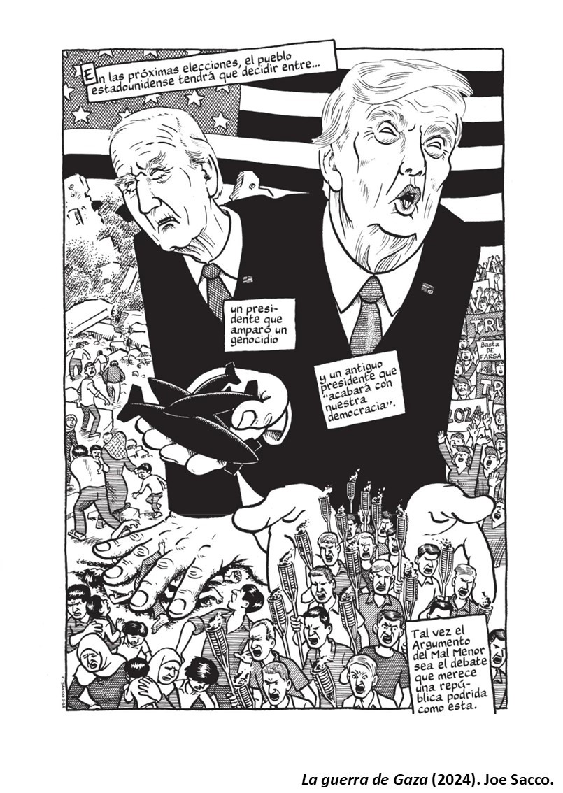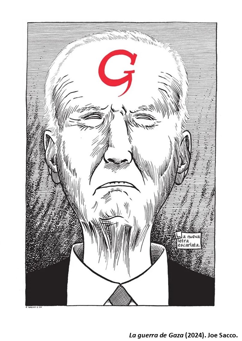 Sembla que Sacco ens parla de la incongruència moral que significa presumir de ser la primera potència del món i actuar com a jutge del que és correcte i del que no (a les Nacions Unides, per exemple), obviant la realitat del seu propi país. I és que Joe Biden és un dels protagonistes de la novel·la gràfica, evidentment. Un Biden a qui el mateix Sacco vaticina que potser algun dia també guanyi el Premi Nobel de la Pau, independentment si té el seny per saber on és o per què el va guanyar. El problema no només el tindrà ell, sinó també qui l’encoratgen. Suports incompressibles que s’agreugen pensant que quan dibuixava aquests fulls encara faltaven setmanes per a les eleccions a la presidència i la perspectiva del resultat era desoladora: «A les properes eleccions, el poble nord-americà haurà de decidir entre un president que va emparar un genocidi i un antic president que “acabarà amb la nostra democràcia”», doncs va guanyar el segon.