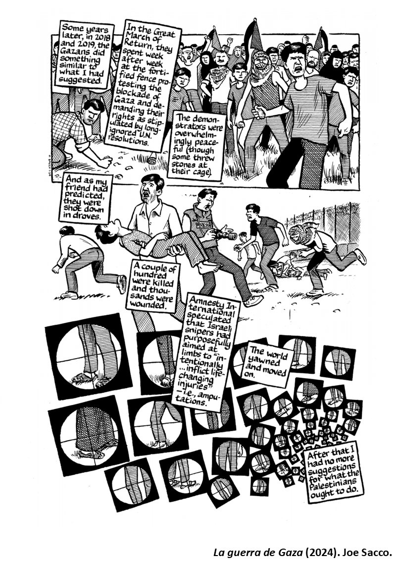 A més, Sacco recorda en una de les seves vinyetes que «Amnistia Internacional va sospitar que els franctiradors israelians van apuntar cap a les extremitats dels manifestants per aconseguir provocar ferides que canviaran la vida dels ferits, és a dir, amputacions de membres». Només un soldat va acabar detingut per no obeir les ordres, i es calcula que el nombre de ferits va poder superar els 3.000 col·lapsant els hospitals. I d’això en fa un lustre. Uns hospitals que ara mateix no existeixen, bombardejats sota la sospita que aixoplugaven terroristes. Suposadament, perquè la majoria dels periodistes que podien haver informat in situ sobre la veracitat de la informació, són morts per culpa dels bombardejos.