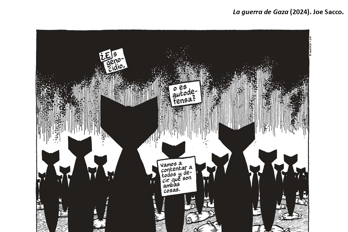 «Quin horror… ¡Gent vivint a tendes de campanya!… ¡Vivint a la misèria!… ¡Ja no tenen casa!… ¡Ni lloc on endreçar-se o fer les seves necessitats!… ¡Gairebé sense menjar!… ¡Sense saber què els oferirà el futur!… ¡Detestats per un món cruel que preferiria veure com desapareixen!», aquest text correspon a una vinyeta de l’últim còmic de Joe Sacco, La guerra de gaza (The War on Gaza, 2024), publicat en castellà per Reservoir Books, amb traducció de Montse Menesos.