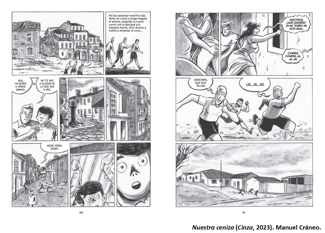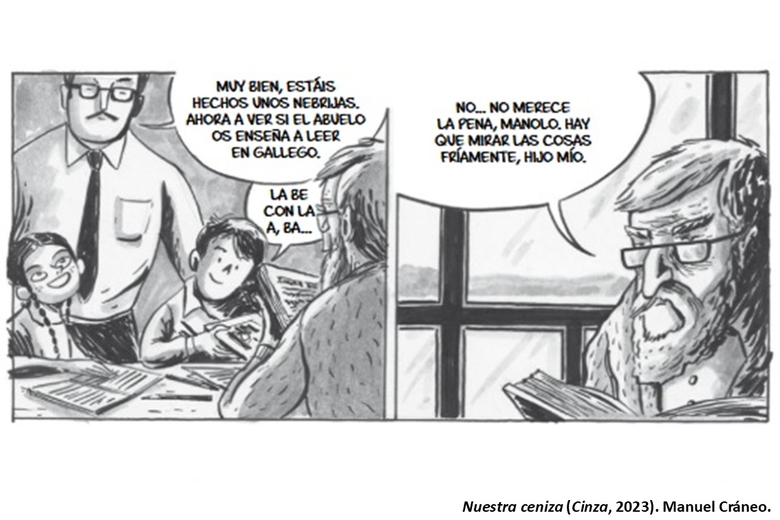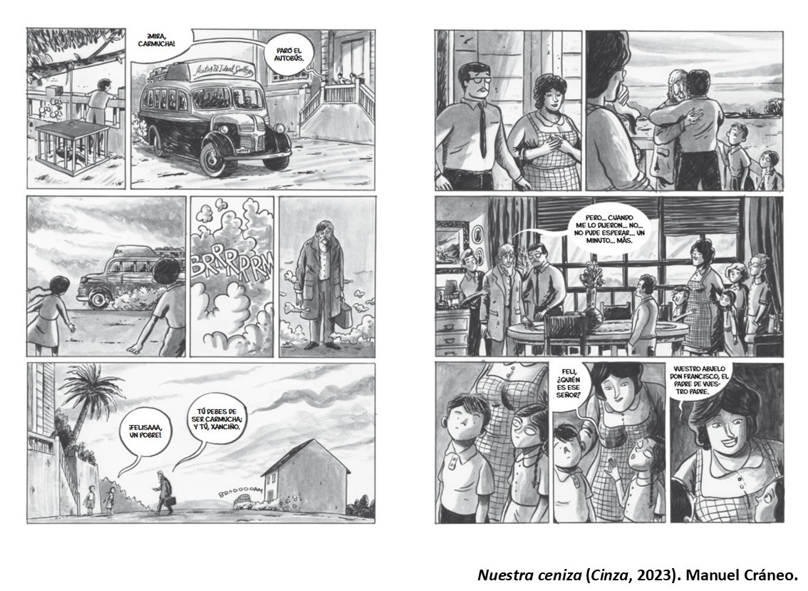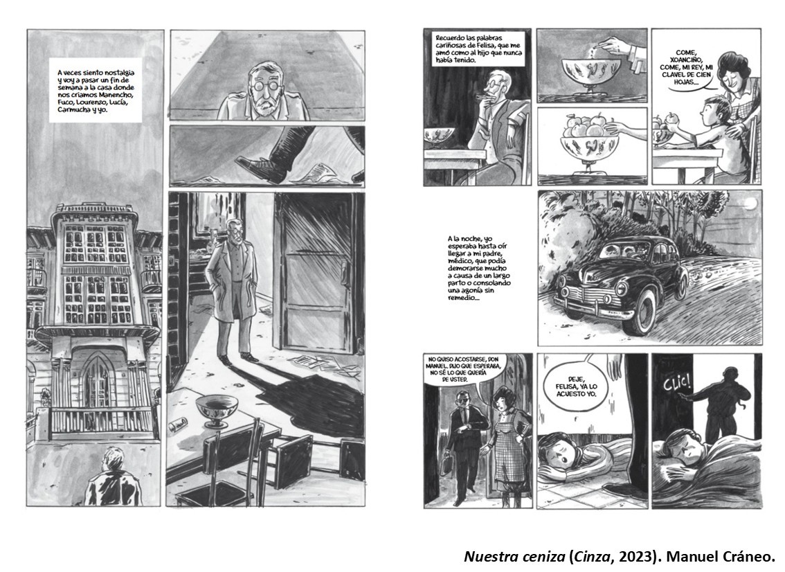 En 2017, fue Alcalá quién tuvo la iniciativa de convertir su obra en una novela gráfica, dotando de imágenes a la narración original, y fue también quién pensó en Manel Cráneo para llevar a cabo la ambiciosa adaptación. Siete años después («tras una pandemia y muchos problemas personales», tal y como indica el autor en la presentación del cómic), finalmente se ha publicado la novela gráfica Nuestra ceniza (Cinza, 2023), publicada en gallego inicialmente por Demo Editorial, y en castellano en junio de 2025 por Ediciones La Cúpula, con guion y dibujo de Manuel Cráneo. Aunque Cráneo reconoce que tuvo que alternar el desarrollo de la novela gráfica con otras producciones artísticas, por lo que su dedicación en esos siete años de trabajo fue intermitente, la realidad es que hay un trabajo ingente de documentación y representación de los numerosos protagonistas de la historia que, además, van creciendo a lo largo de los años.