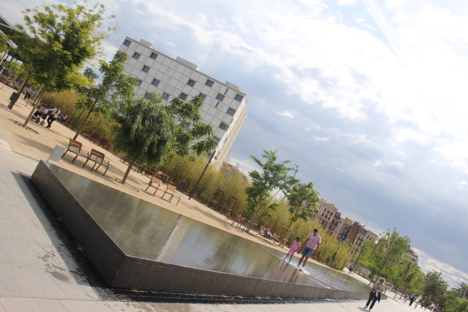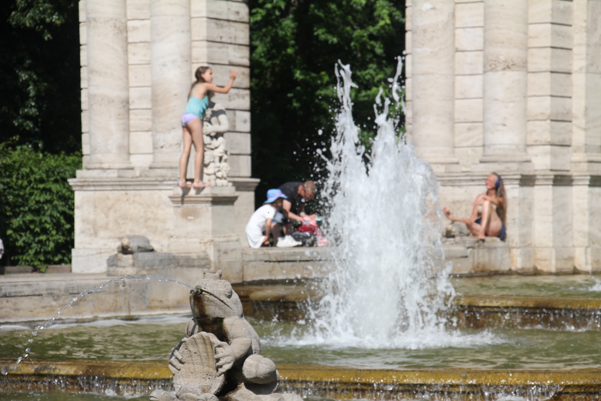 En esta, los niños eran reyes acuáticos, divirtiéndose mientras padres, familiares y amigas se mojaban los pies y charlaban en los bordes. En uno de los ángulos del recinto una mujer leía. En otro un hombre dormitaba sin perder la conexión con los alrededores. La fuente es patrimonio de Alemania y quizá consiente este glorioso vaivén al englobarse dentro de una zona verde, algo que conviene remarcar, pues quizá se juzgaría demasiado bañarse en centralidades, lo que en este instante tampoco es tan descabellado mientras no se atente contra el Arte, al que imagino feliz por la interacción humana, bien útil para quitarle solemnidad y aceptar la reconversión de los usos en función de los contextos.