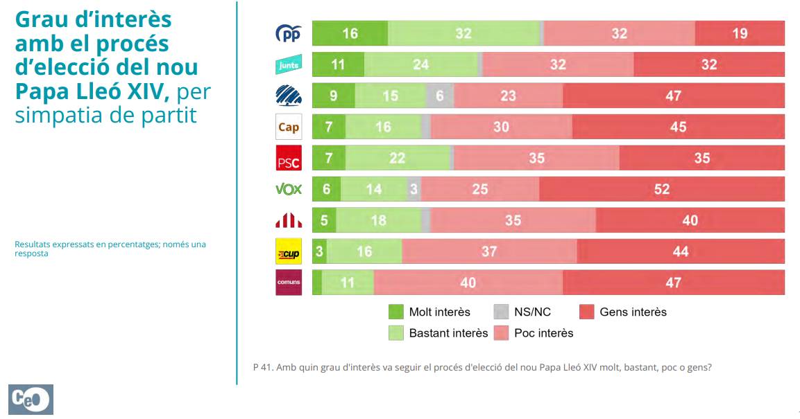Cuanto más jóvenes son los catalanes, menos interés muestran por lo que ha pasado en el Vaticano estos últimos meses, mientras que las personas que más importancia le han dado son las mujeres de más de 64 años, con un 44% (basta con ver quién ocupa los bancos de las iglesias habitualmente). Por simpatías de partido, los más “papistas” son los votantes del PP, Junts y PSC.