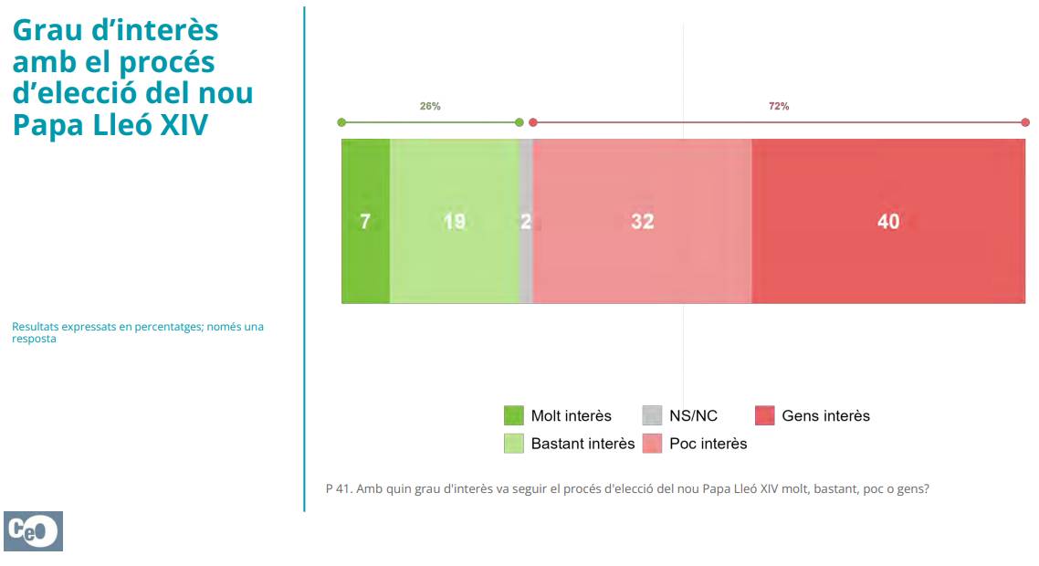 Pero he aquí que la última encuesta del Centro de Estudios de Opinión (CEO) indica que no soy el único catalán rarito que tiene poco o ningún interés por la elección del Papa y que lo comparto con una amplísima mayoría de conciudadanos. Según el estudio demoscópico de la Generalitat, el 72% pasa de la elección del nuevo Papa, mientras que el 26% tiene “mucho” o “bastante” interés. Y seis de cada diez personas no dan ningún valor a la opinión del Papa o no consideran importante lo que piense o deje de pensar.