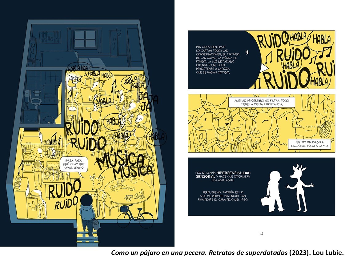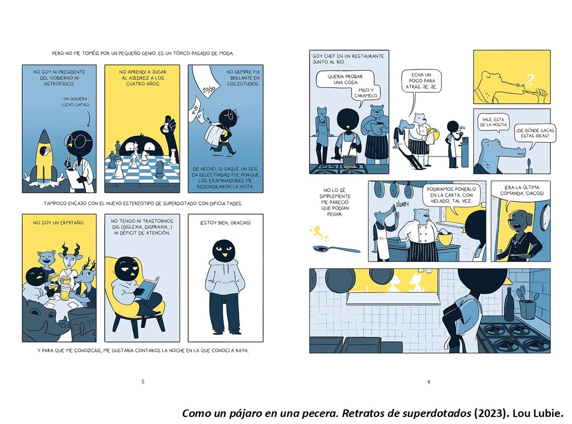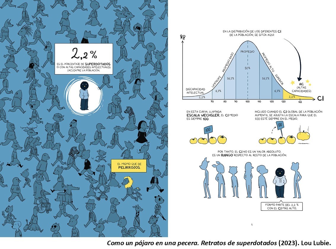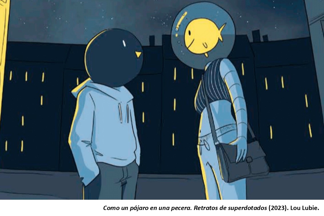 En Como un pájaro en una pecera, Lou Lubie muestra la evolución científica a lo largo del siglo XX hasta la actualidad en lo que hace referencia a la definición y uso de los test y de los diferentes conceptos asociados, así como la evolución del término «coeficiente intelectual» y la interpretación de los números que lo escalan. Y todo ello intercalado con experiencias cotidianas y reflexiones personales que permite al lector una mejor comprensión de los aspectos humanos que acontecen en el día a día de los superdotados. La lectura de esta novela gráfica ayuda a comprender el motivo que llevó a Birdo, el amigo de la autora, a aprender a ocultar su diferencia para evitar las reacciones muchas veces indiscretas que, en realidad, mezclaban curiosidad y desprecio en cantidades equivalentes en la mayoría de las ocasiones. Ahora disponemos de un instrumento que permitirá disminuir los prejuicios y estereotipos asociados a las personas con altas capacidades intelectuales… si lo leemos, claro