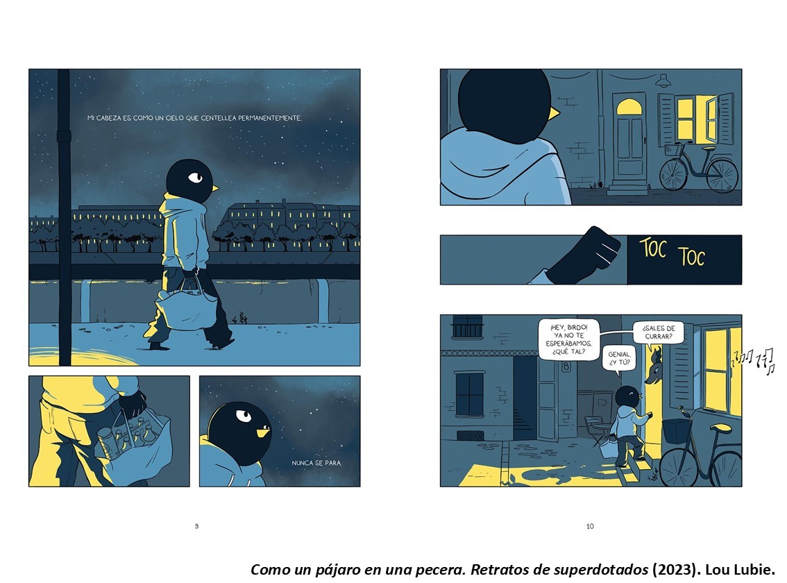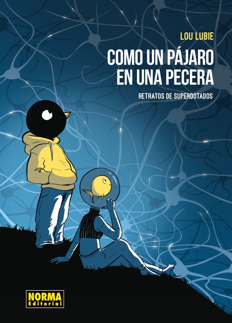 De esta manera, Birdo es un pajarito negro enfundado en un gran jersey porque es discreto, además, permitía anonimizarlo, puesto que el amigo que le había inspirado, no ha reconocido su condición a nadie de su entorno, ni siquiera a sus actuales amigos (la autora se sorprendió con su confesión). No tiene ningún problema en aceptar su condición, puesto que desde muy pequeño fue informado y acompañado por sus padres (en el cómic observamos los problemas asociados al asistir a cursos avanzados en edad escolar), pero admite que no le gusta como le escudriñan cuando es identificado. Raya, en cambio, es un pececillo en una pecera que tiene miedo de ser desenmascarada, además de padecer claramente el síndrome del impostor. El movimiento caótico y expresivo del pez sirve para mostrar los sentimientos del personaje de forma clarividente. La novela gráfica evoca la vida cotidiana de estos dos adultos con altas capacidades, en unas viñetas donde prevalece una gama de azules realzada con toques de amarillo, lo que permite a la autora remarcar el contraste en muchas situaciones, especialmente las que son agresivas para ellos, como, por ejemplo, cuando se les exige una gran interacción social, debido a su hipersensibilidad y su emocionalidad. Esta actitud los puede llevar fácilmente a su aislamiento y causarles una fuerte sensación de soledad, agravado por el hecho de que no siempre son conscientes de su particularidad y pueden tender a subestimarse, como es el caso de Raya.