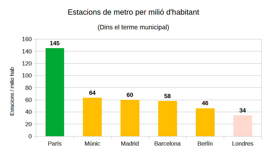 En metro, París ciutat té una dotació que és de més del doble de la següent ciutat, degut en part a què fins a la Segona Guerra Mundial hi va haver a la capital francesa dues xarxes que competien entre si, a més del fort desenvolupament del RER. Barcelona, sumant les estacions de TMB i FGC, es troba en una bona posició, semblant a la de Madrid i Múnic. Londres tanca la taula.