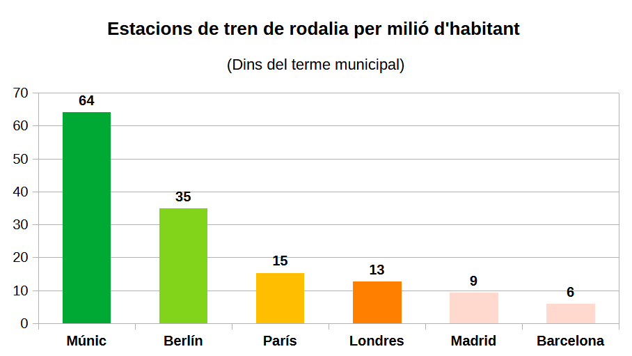 Però tornant a Barcelona. La ciutat té el ferrocarril que necessita? Tot a la vida és relatiu, per la qual cosa el més assenyat és sempre acudir a la comparació internacional. Per acompanyar Barcelona a l’anàlisi he triat Madrid, París, Berlín, Múnic i Londres. Sis ciutats en total. I he considerat únicament l’oferta de ferrocarril al seu terme municipal, molt petit en el cas de París i Barcelona, enorme en el cas de la capital britànica i intermedi en el cas de les dues ciutats alemanyes.