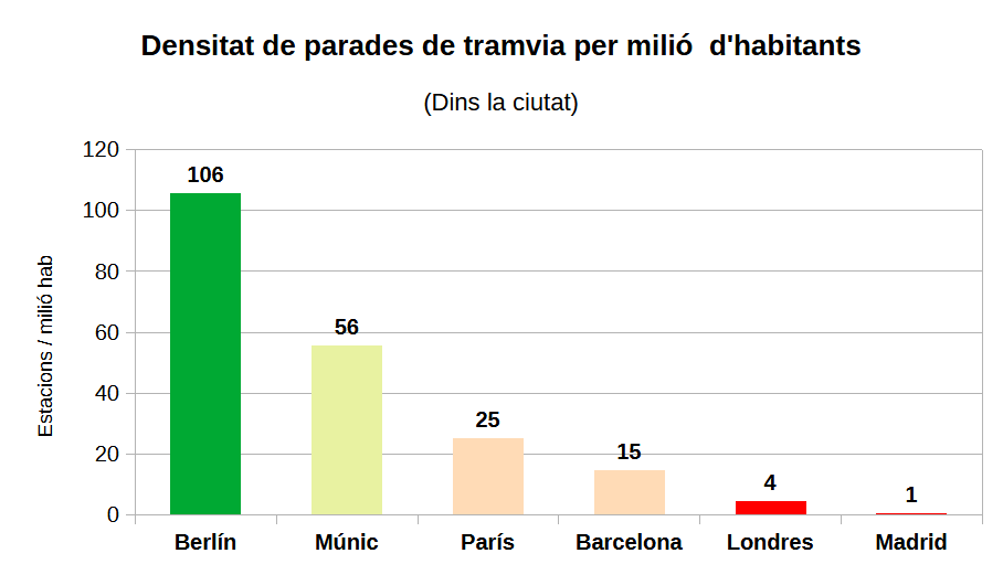 I pel que fa al tramvia, aquí és on trobem les diferències més àmplies. Des de les fabuloses 106 estacions per milió d’habitants de Berlín fins a les anecdòtiques 4 de Londres i només 1 de Madrid.