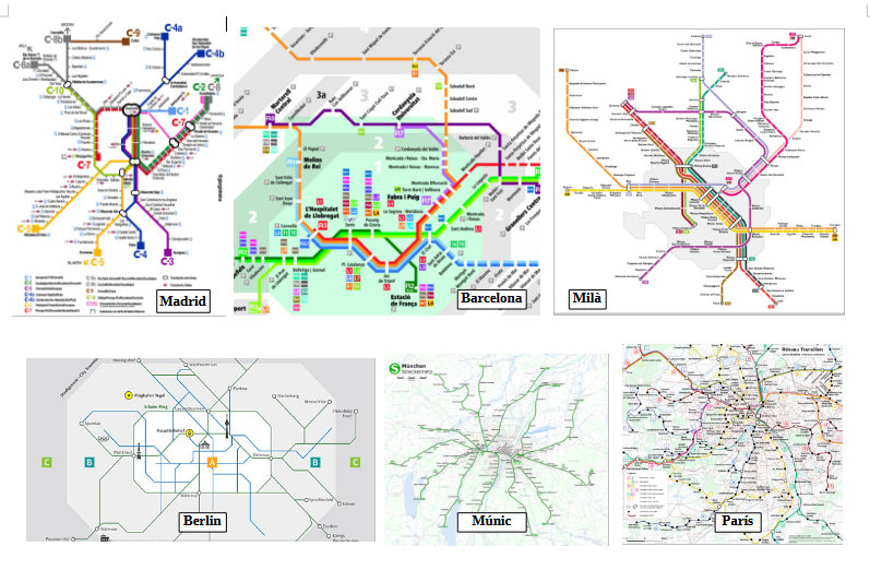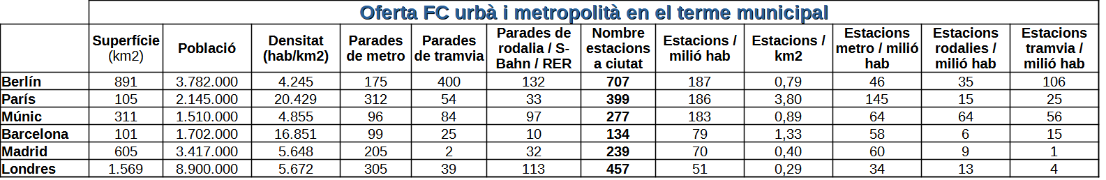 Per a cada ciutat he recopilat, a més de les dades bàsiques, el nombre d’estacions de metro, les de tramvia i les de rodalies situades a l’interior del seu perímetre urbà. Les característiques del metro i del tramvia són molt semblants a totes les ciutats. Però els serveis de rodalies són força diferents quant a les seves característiques d’operació. Els de Barcelona i Madrid són pràcticament iguals; el de París, el Transilien, és el més potent de tot Europa fins al punt que mou el triple d’usuaris que tot el metro de Barcelona; els de Berlín i Múnic són els S-Bahn amb característiques intermèdies entre les nostres rodalies i el metro; i el de Londres, comparativament el més pobre de tots, té propietats molt diferents. Podríem dir que és un rodalies a mig fer.