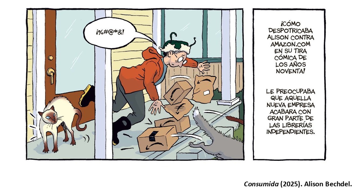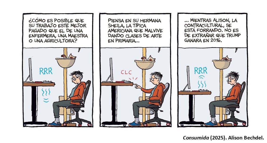 De Marx recupera els títols dels seus capítols mentre exposa com és de difícil no ser víctima del nou capitalisme consumista. En una de les vinyetes es pregunta «Com és possible que el treball d’una autora de còmics estigui més ben pagat que una infermera, una mestra o una agricultora? Pensa en la seva germana Sheila, la típica americana que malviu fent classes d’art a primària… mentre Alison, la contracultural, està guanyant molts diners», i afegeix «No és estrany que Trump guanyés el 2016». Aquesta doppelgänger pessimista, cansada i confusa probablement contrasta amb l’Alison original, encara que l’autora reconeix els continus conflictes que apareixen a la seva vida quotidiana, mentre reapareixen altres en la societat que ja pensava guanyats, amb el desconcert que genera. Tot i que, a Consumida, al final, hi ha un bri d’esperança.