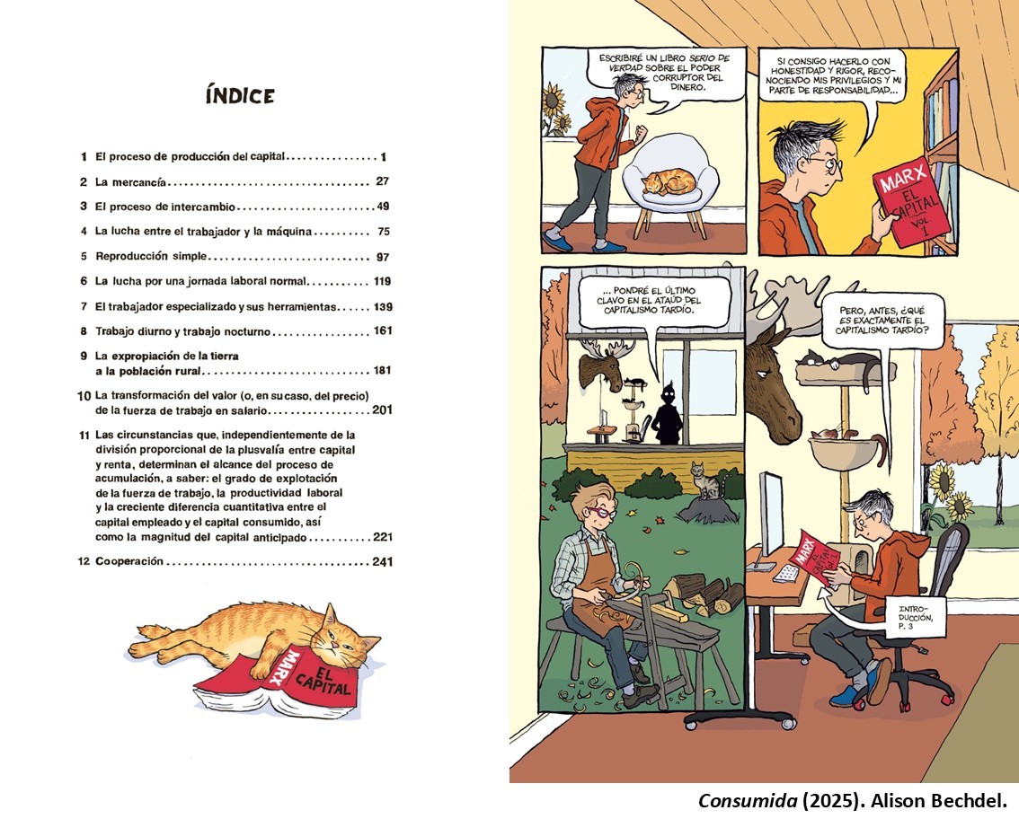 Alison, el personatge que emula Bechdel a la novel·la gràfica, pretén ensenyar els seus lectors (o espectadors, si aconsegueix convertir-lo en sèrie de televisió, cosa que, presumiblement, li donarà més difusió i li farà guanyar més diners), a «alliberar-se del capitalisme consumista i a portar una vida més ètica». I ho fa sincerant-se a través de les contradiccions quotidianes que deu bregar contínuament. Com recordar que als anys noranta denunciava a Amazon per l’impacte que podia realitzar al petit comerç en general i a les llibreries en particular, mentre avui en dia realitza una gran part de les seves compres (algunes sense sentit) a través d’aquesta plataforma, en reconèixer la facilitat per comprar i els avantatges que t’ho portin directament al teu domicili, i més quan vius a una granja apartada. Bechdel decideix preparar-se davant d’aquest nou repte creatiu llegint-se l’assaig El Capital. Crítica de l’economia política (Das Kapital. Kritik der politischen Ökonomie, 1867), de Karl Marx (1818-1883).