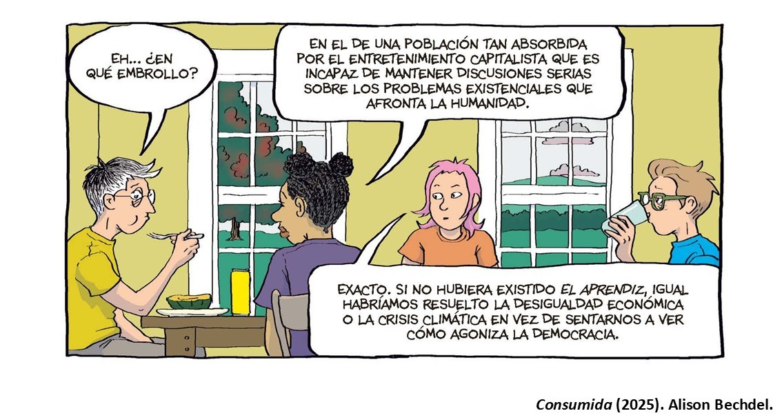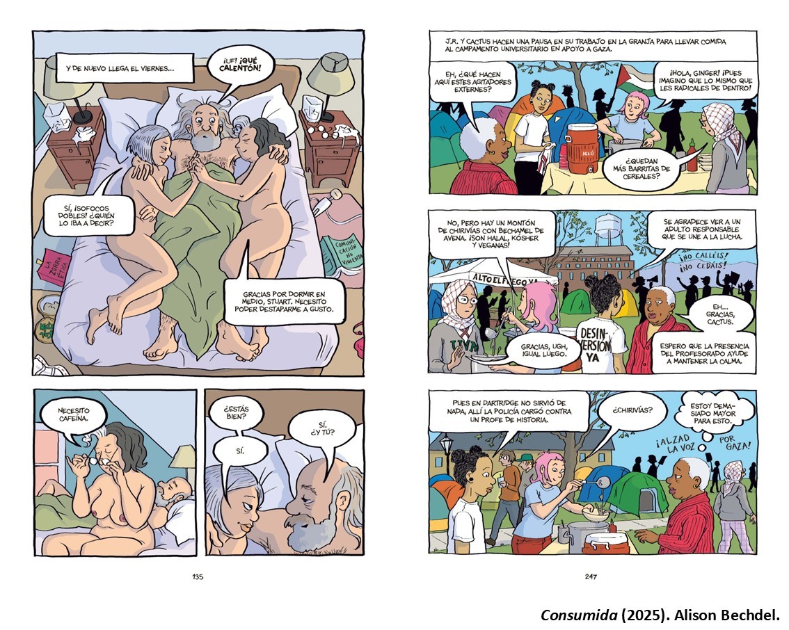 Bechdel va decidir fer una nova novel·la gràfica que reflectís com veia ella la societat del moment, des de la seva maduresa com a persona i artista, davant dels reptes que podria suposar una possible nova victòria republicana. El resultat és Consumida (Splent: A Comic Novel, 2025), amb guió i dibuix d’Alison Bechdel, i color de Holly Rae Taylor, que ja havia realitzat tasques de colorista amb anterioritat, i que en aquest cas té un paper molt important en la seva elaboració, no sols per ser una primera lectora crítica i motivadora, sinó per coprotagonitzar la història. La parella a la vida real apareix a la portada de la novel·la gràfica, emulant el quadre American Gothic (1930), del pintor Grant Wood (1891-1942), parodiant la mítica imatge del granger amb un trident acompanyat de la seva filla amb davantal, que enaltia les feines pròpies del camp i de la llar. Publicada en castellà el setembre del 2025, tot just tres mesos després de la versió nord-americana, pel segell Reservoir Books del Grupo Editorial Penguin Random House, amb traducció de Rocío de la Maya.