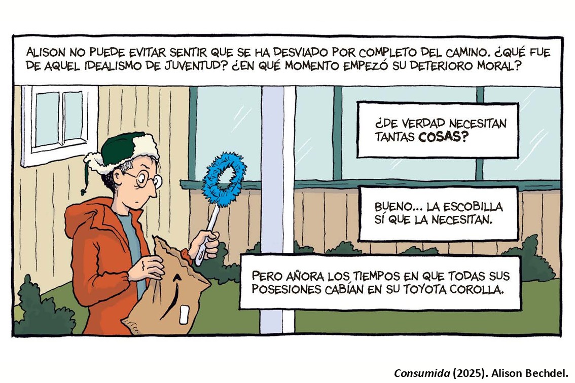 De Marx recupera els títols dels seus capítols mentre exposa com és de difícil no ser víctima del nou capitalisme consumista. En una de les vinyetes es pregunta «Com és possible que el treball d’una autora de còmics estigui més ben pagat que una infermera, una mestra o una agricultora? Pensa en la seva germana Sheila, la típica americana que malviu fent classes d’art a primària… mentre Alison, la contracultural, està guanyant molts diners», i afegeix «No és estrany que Trump guanyés el 2016». Aquesta doppelgänger pessimista, cansada i confusa probablement contrasta amb l’Alison original, encara que l’autora reconeix els continus conflictes que apareixen a la seva vida quotidiana, mentre reapareixen altres en la societat que ja pensava guanyats, amb el desconcert que genera. Tot i que, a Consumida, al final, hi ha un bri d’esperança.