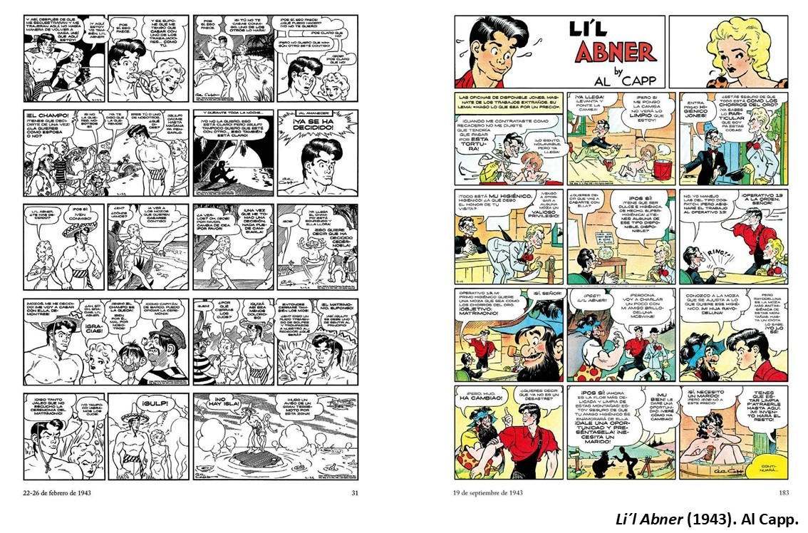 Cuando John Steinbeck (1902-1968) ganó el Premio Nobel de Literatura en 1962 le preguntaron quién era su escritor favorito del momento, y su respuesta fue contundente: Al Capp, al que postuló como candidato. En este caso, tenemos la suerte que Diábolo Ediciones está publicando la colección de Li´L Abner (1934-1977) desde el inicio, incorporando en cada tomo dos años de tiras diarias y de páginas dominicales. Es una colección que empezó en plena Gran Depresión, en los años treinta, en el que el contraste cómico se produce en este caso entre una familia rural del interior de Estados Unidos con la parte adinerada de la familia que vive en la gran ciudad.