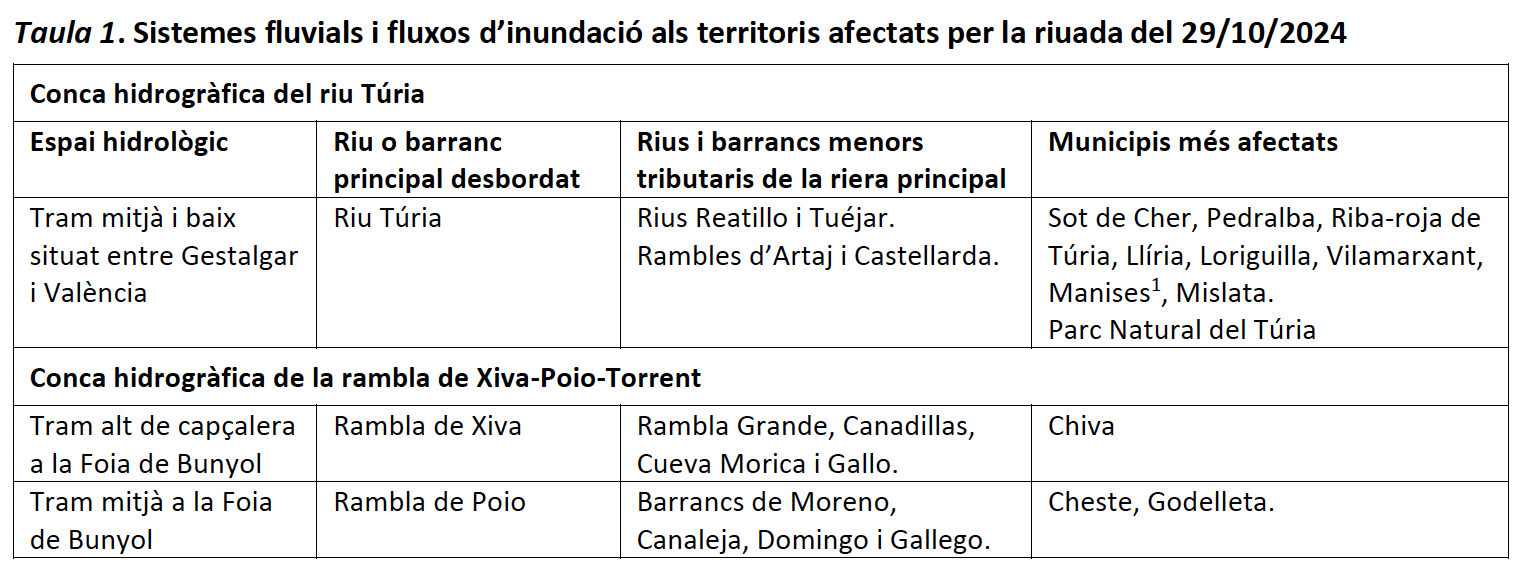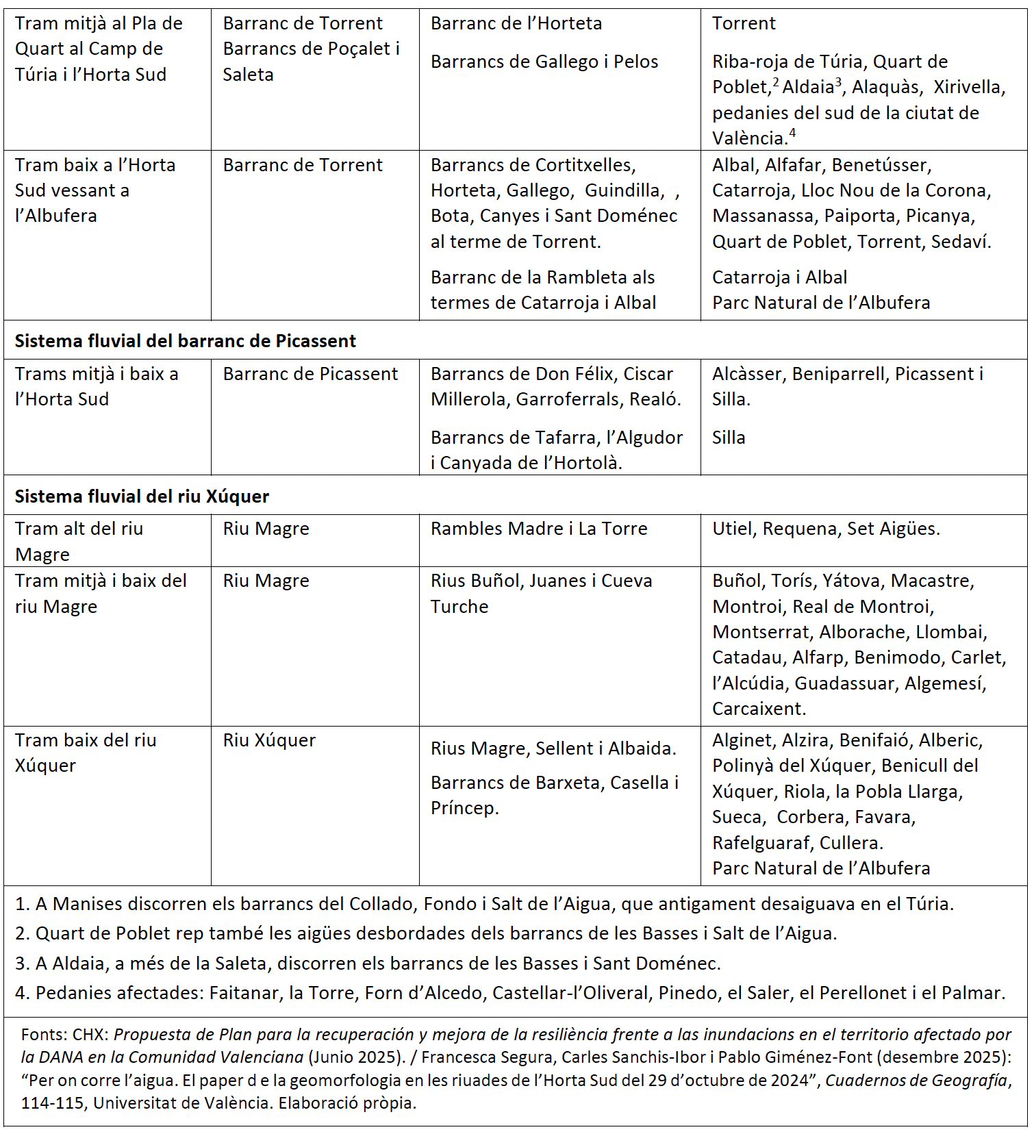 Al llarg de 2025 s’han publicat diverses investigacions per a comprendre la dinàmica fluvial dels rius i barrancs desbordats durant la vesprada-nit del 29 d’octubre de 2024 (d’ara endavant 29-O). Estudis que han desmentit l’allau de faules i desinformacions sobre aquesta qüestió que van circular després de la DANA i que han servit per aclarir científicament què va passar aquell tràgic dia. En la Taula 1 mostrem la dimensió de la inundació citant les rieres desbordades, tant principals com afluents, i els municipis més afectats. Aquesta informació ha estat confeccionada sobre la base de dos rigorosos documents. El primer és la “Propuesta de Plan para la recuperación y mejora de la resiliència frente a las inundacions en el territorio afectado por la DANA en la Comunidad Valenciana”, presentat a consulta pública per la Confederació Hidrogràfica del Xúquer (CHX) en juny 2025: https://www.miteco.gob.es/es/agua/participacion-publica/consulta-publica-plan-resiliencia-dana-valencia.html. El segon és l’article publicat en desembre de 2025 en Cuadernos de Geografía, 114-15, titulat “Per on corre l’aigua. El paper de la geomorfologia en les riuades de l’Horta Sud del 29 d’octubre de 2024”: https://turia.uv.es/index.php/CGUV/index. Un estudi elaborat per Francesca Segura, Carles Sanchis i Pablo Giménez, investigadors de les universitats de València, Alacant i Politècnica de València. Es recomanable consultar aquests informes per a una millor comprensió dels processos d’inundació provocats pels rius Magre, Xúquer i Túria, la rambla de Xiva-Poio-Torrent, el barranc de Picassent i els barrancs afluents o tributaris d’aquestes conques principals. I també per a estar millor informats com a ciutadans i més preparats davant futures inundacions.