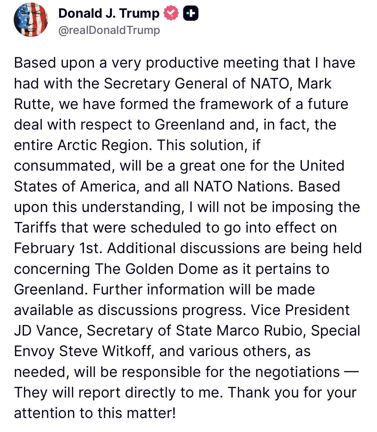 Pocas horas después de su discurso, Trump anunciaba en su red social True Social que “después de una reunión muy productiva con el secretario general de la OTAN Mark Rutte…no impondré los impuestos (tariffs) que tenían que entrar en vigor el 1 de febrero [a los países como Francia, UK o Alemania que habían movilizado tropas a Greonlandia]. Conversaciones adicionales están teniendo lugar en relación al Golden Dome [el sistema de protección antimisiles] ya que pertenece a Greonlandia.