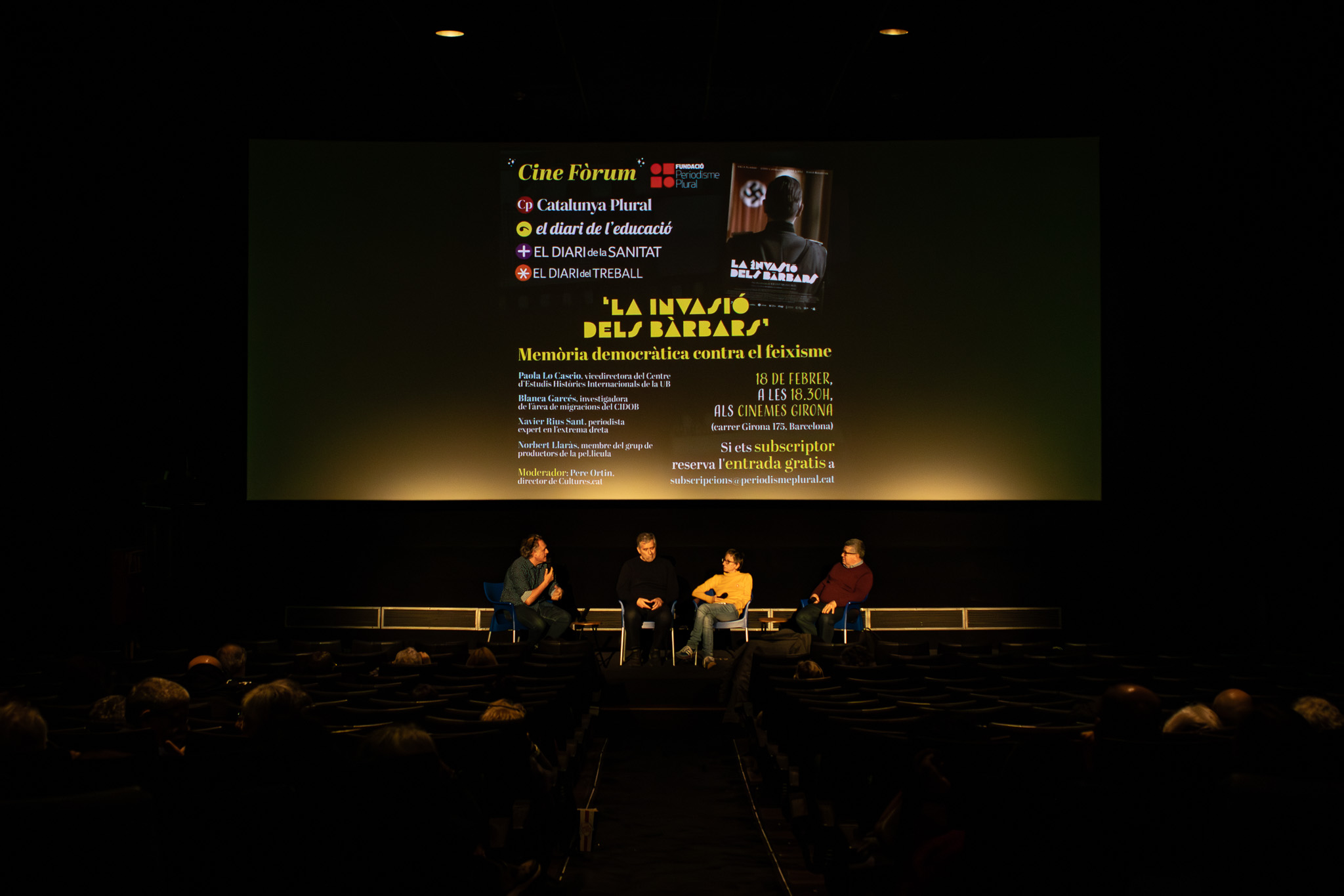 La Fundació Periodisme Plural ha convocat aquest dimecres 18 de febrer una sessió de debat sobre la memòria històrica de la guerra civil i el franquisme als cinemes Girona, a Barcelona, a partir de la projecció de la pel·lícula “La invasió dels bàrbars”. Abans de projectar-la, el director de la pel·lícula, Vicent Monsonís, ha explicat que està basada en una obra de teatre de Chema Cardeña i que amb ella ret homenatge als seus avis i tanta gent com va patir la guerra civil i la repressió franquista. Ha assegurat que aquestes persones i els seus familiars “volen justícia, no venjança”.