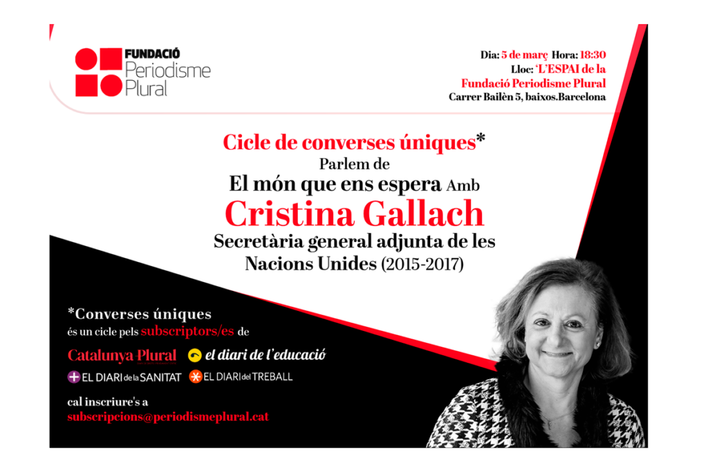 Cristina Gallach ha viscut en primera línia l’evolució del món al llarg de mig segle, primer com a periodista i després en l’exercici d’altes responsabilitats en l’àmbit internacional. La seva mirada és una de les més clarividents a l’hora d’analitzar els riscos que afronten les democràcies i els drets humans davant les polítiques reaccionàries que impulsen Donald Trump i les extremes dretes europees. Gallach va ser secretària general adjunta de les Nacions Unides, el que li aporta una visió global de ‘el món que ens espera’.