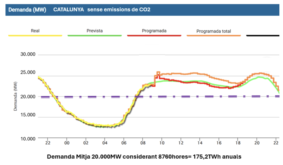 En aquest context, una corba estàndard de demanda diària podria correspondre a la representada a la figura 1, extrapolada de dades de Redeia, mostrant la distribució horària típica del consum, o bé a una distribució més homogènia en un escenari ideal d’optimització de xarxa. Els consums dels diferents sectors —indústria, residencial, serveis o transport electrificat— configuraran escenaris intermedis, però en termes mitjans el sistema hauria de sostenir una demanda contínua de l’ordre de 20 GW, coherent amb els 175 TWh anuals previstos.